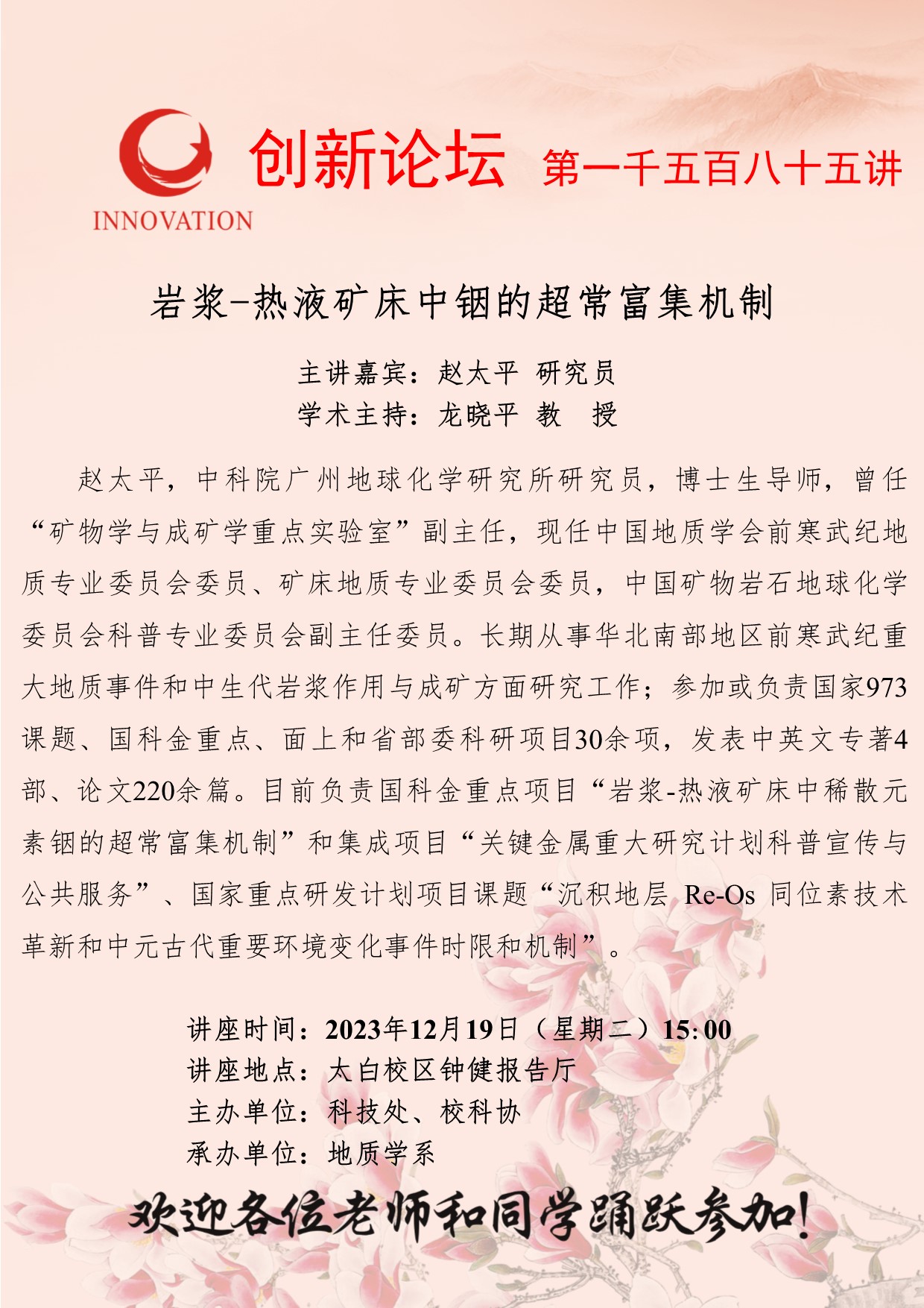 赵太平 研究员 九游会在线登录官网创新论坛第一千五百八十五讲:岩浆-热液矿床中铟的超常富集机制 讲座时间 2023年12月19日(星期二)15:00 讲座地点 太白校区钟健报告厅 讲座人介绍 赵太平 研究员 讲座内容