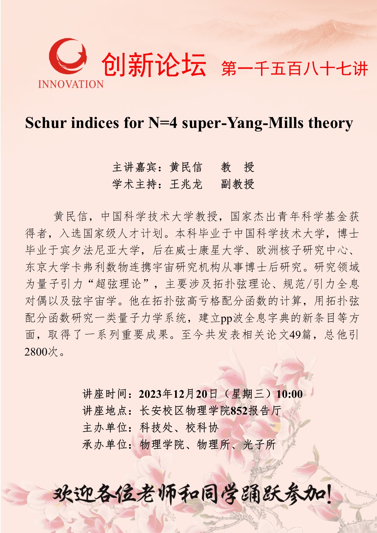 黄民信 教 授 九游会在线登录官网创新论坛第一千五百八十七讲:Schur indices for N=4 super-Yang-Mills theory 讲座时间 2023年12月20日(星期三)10:00 讲座地点 长安校区物理学院852报告厅 讲座人介绍 黄民信 教 授 讲座内容