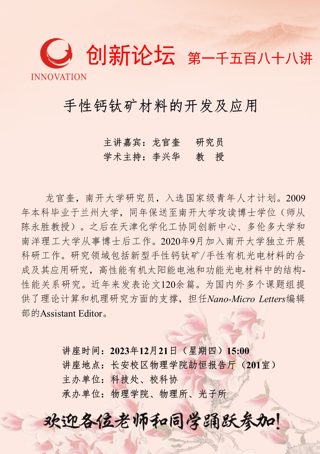龙官奎 研究员 九游会在线登录官网创新论坛第一千五百八十八讲:手性钙钛矿材料的开发及应用 讲座时间 2023年12月21日(星期四)15:00 讲座地点 长安校区物理学院劼恒报告厅(201室) 讲座人介绍 龙官奎 研究员 讲座内容