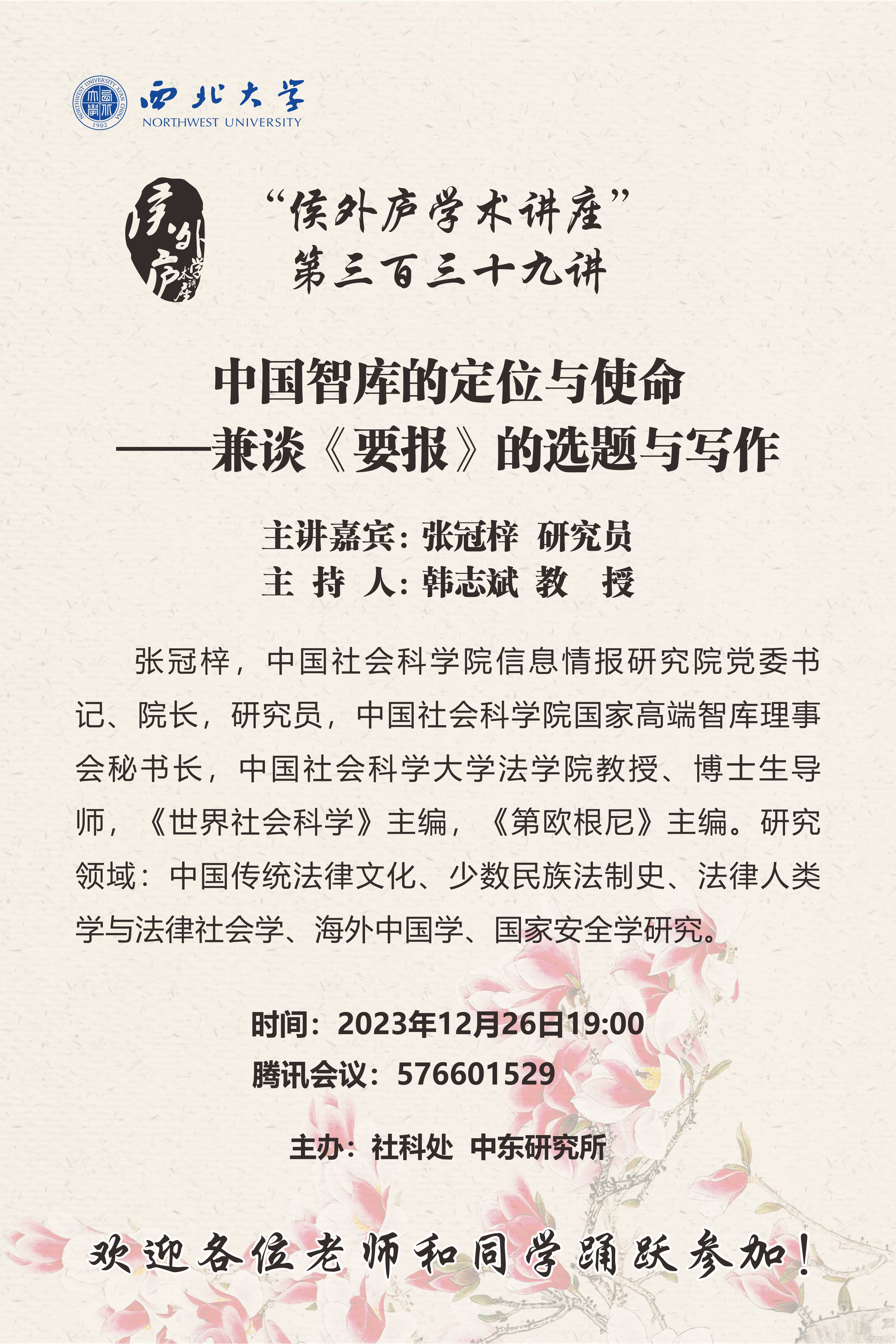 侯外庐学术讲座第三百三十九讲:中国智库的定位与使命——兼谈《要报》的选题与写作