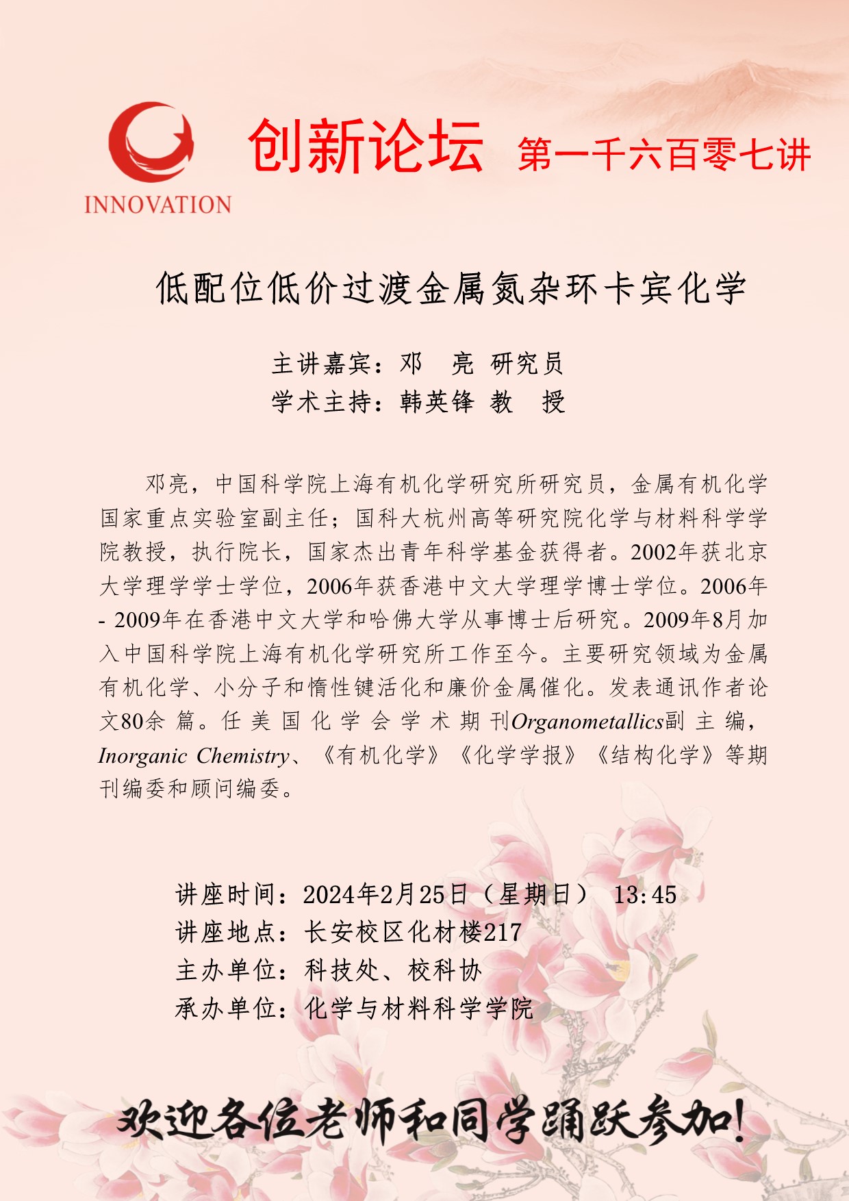 邓亮 研究员 九游会在线登录官网创新论坛第一千六百零七讲: 低配位低价过渡金属氮杂环卡宾化学 讲座时间 2024年2月25日(星期日) 13:45 讲座地点 长安校区化材楼217 讲座人介绍 邓亮 研究员 讲座内容