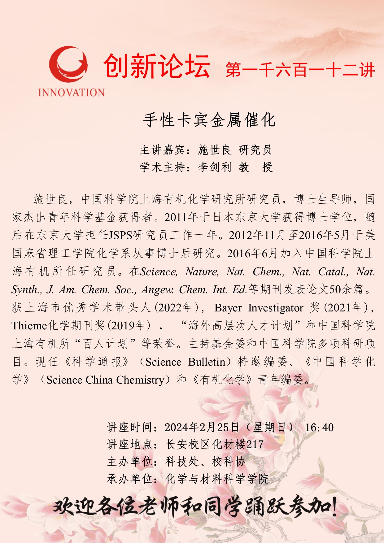施世良 研究员 九游会在线登录官网创新论坛第一千六百一十二讲:手性卡宾金属催化 讲座时间 2024年2月25日(星期日) 16:40 讲座地点 长安校区化材楼217 讲座人介绍 施世良 研究员 讲座内容