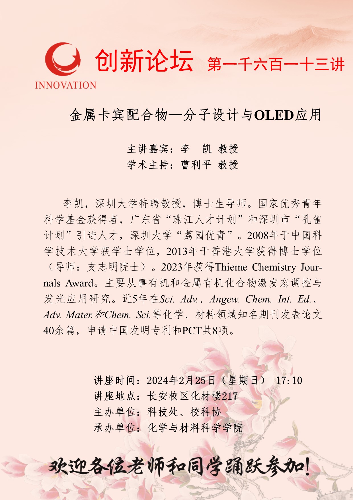 李凯 教授 九游会在线登录官网创新论坛第一千六百一十三讲:金属卡宾配合物—分子设计与OLED应用 讲座时间 2024年2月25日(星期日) 17:10 讲座地点 长安校区化材楼217 讲座人介绍 李凯 教授 讲座内容