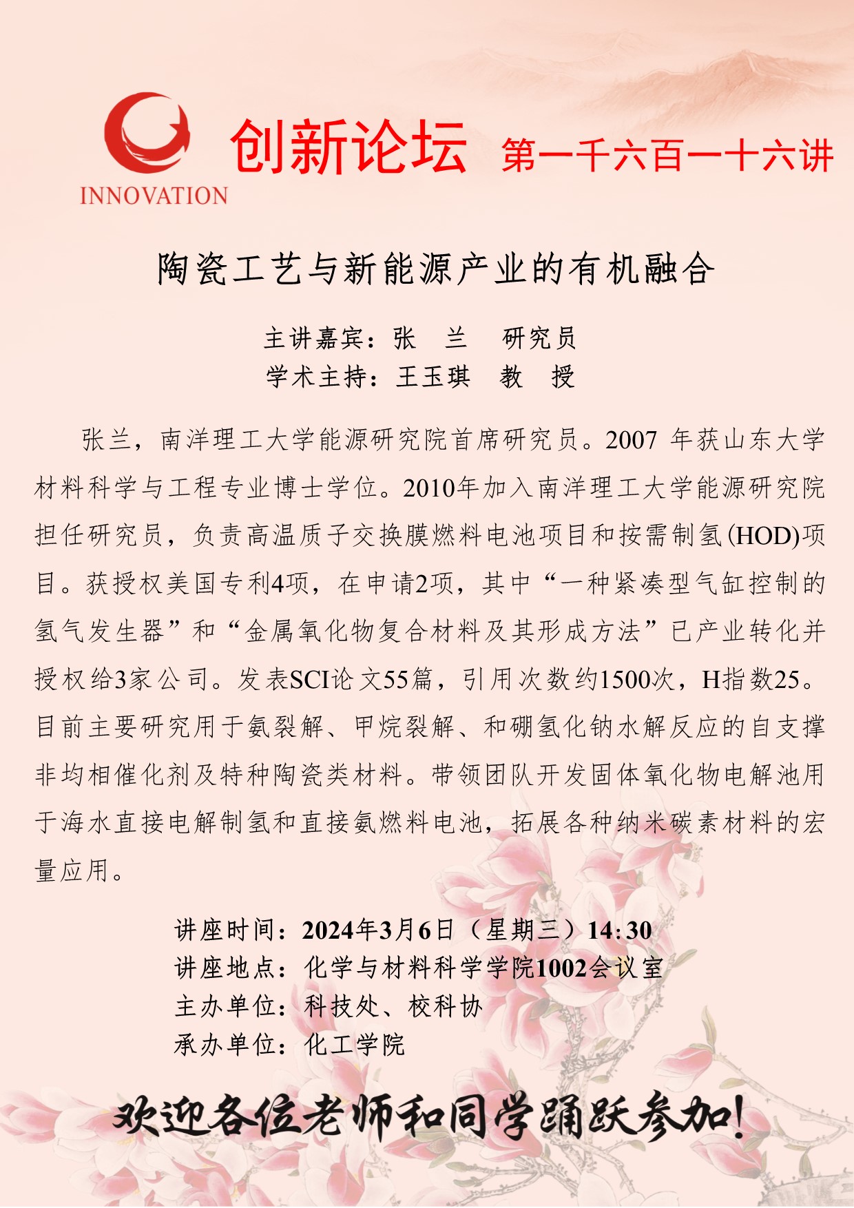 张兰 研究员 九游会在线登录官网创新论坛第一千六百一十六讲:陶瓷工艺与新能源产业的有机融合 讲座时间 2024年3月6日(星期三)14:30 讲座地点 化学与材料科学学院1002会议室 讲座人介绍 张兰 研究员 讲座内容