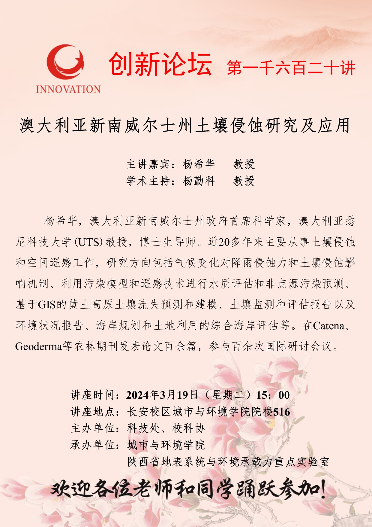 杨希华 教授 九游会在线登录官网创新论坛第一千六百二十讲:澳大利亚新南威尔士州土壤侵蚀研究及应用 讲座时间 2024年3月19日(星期二)15:00 讲座地点 长安校区城市与环境学院院楼516 讲座人介绍 杨希华 教授 讲座内容