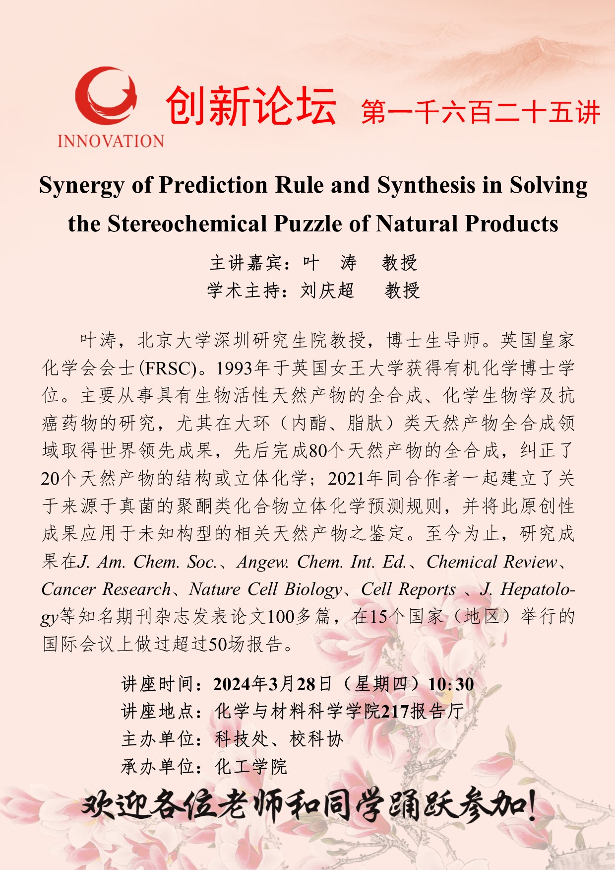 叶涛 教授 九游会在线登录官网创新论坛第一千六百二十五讲:Synergy of Prediction Rule and Synthesis in Solving the Stereochemical Puzzle of Natural Products 讲座时间 2024年3月28日(星期四)10:30 讲座地点 化学与材料科学学院217报告厅 讲座人介绍 叶涛 教授 讲座内容