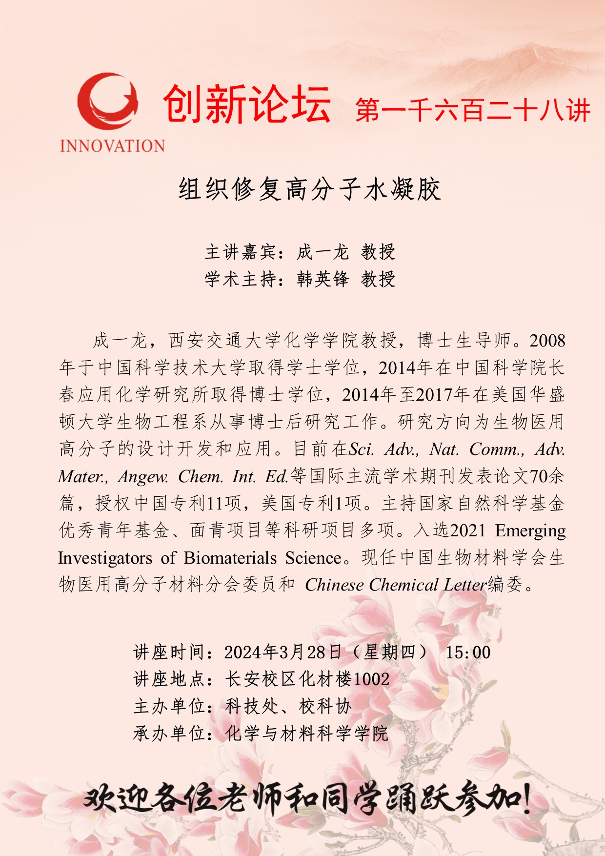 成一龙 教授 九游会在线登录官网创新论坛第一千六百二十八讲:组织修复高分子水凝胶 讲座时间 2024年3月28日(星期四) 15:00 讲座地点 长安校区化材楼1002 讲座人介绍 成一龙 教授 讲座内容