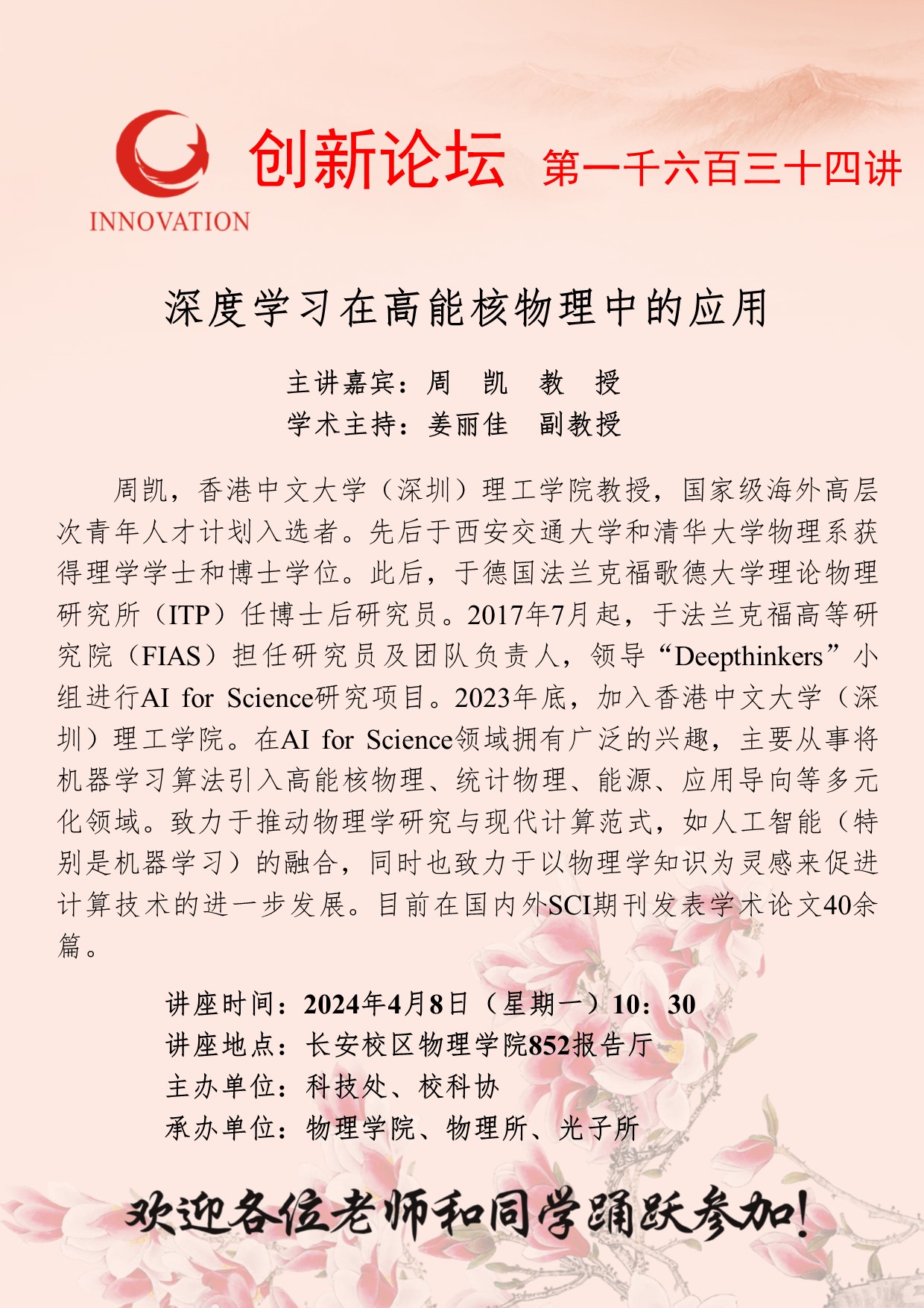 周凯 教授 九游会在线登录官网创新论坛第一千六百三十四讲:深度学习在高能核物理中的应用 讲座时间 2024年4月8日(星期一)10:30 讲座地点 长安校区物理学院852报告厅 讲座人介绍 周凯 教授 讲座内容