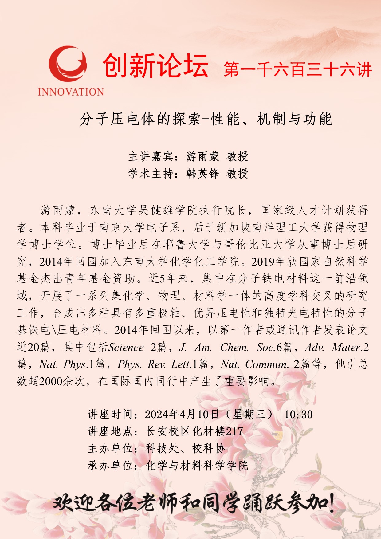 游雨蒙 教授 九游会在线登录官网创新论坛第一千六百三十六讲:分子压电体的探索-性能、机制与功能 讲座时间 2024年4月10日(星期三) 10:30 讲座地点 长安校区化材楼217 讲座人介绍 游雨蒙 教授 讲座内容