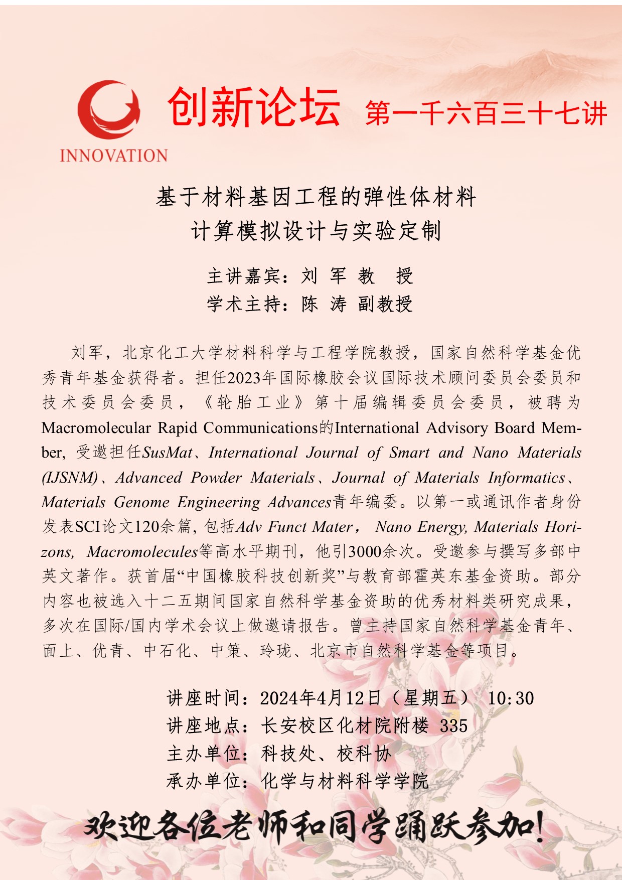 刘军 教授 九游会在线登录官网创新论坛第一千六百三十七讲:基于材料基因工程的弹性体材料计算模拟设计与实验定制 讲座时间 2024年4月12日(星期五) 10:30 讲座地点 长安校区化材院附楼335 讲座人介绍 刘军 教授 讲座内容