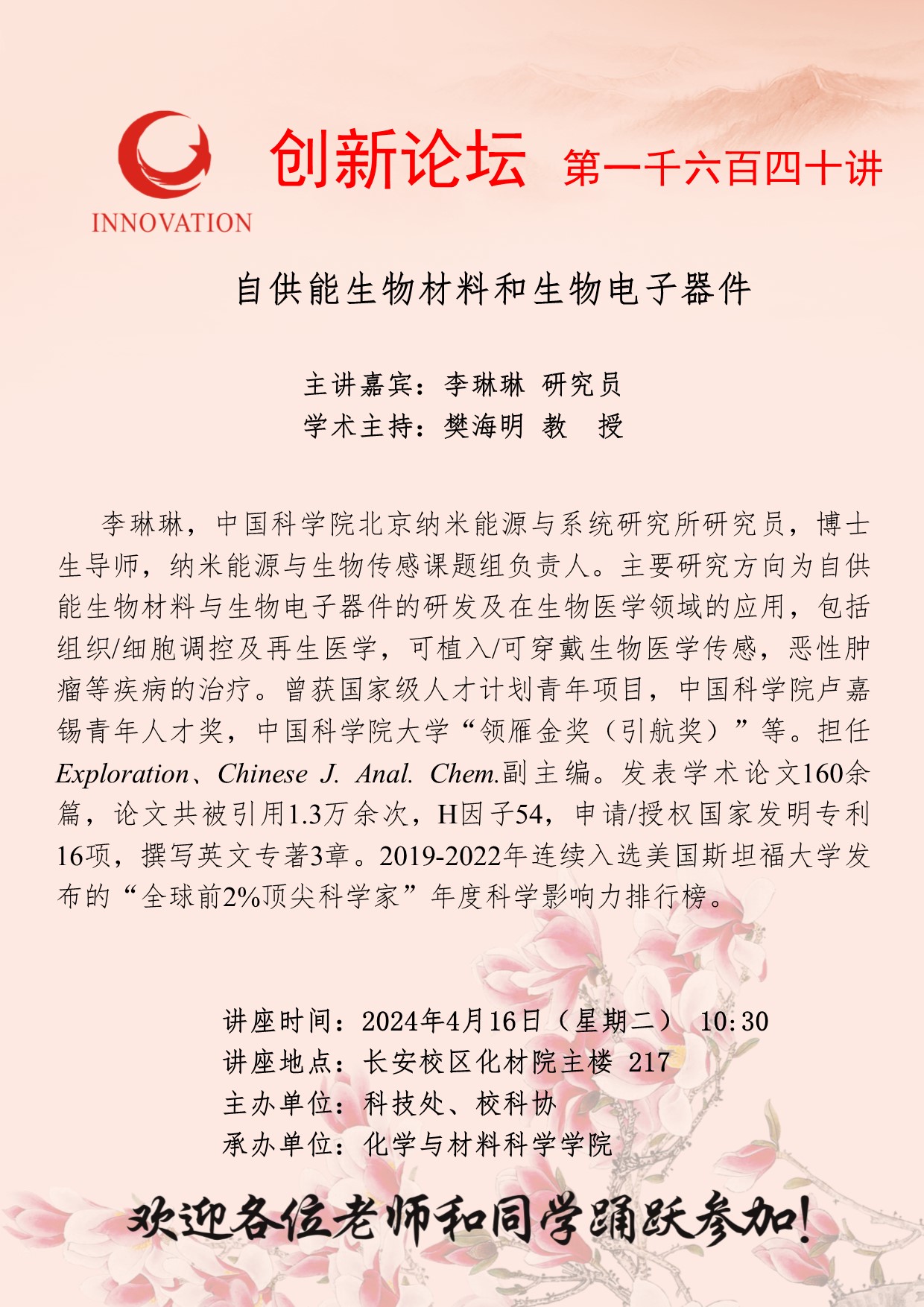 李琳琳 研究员 九游会在线登录官网创新论坛第一千六百四十讲:自供能生物材料和生物电子器件 讲座时间 2024年4月16日(星期二) 10:30 讲座地点 长安校区化材院主楼 217 讲座人介绍 李琳琳 研究员 讲座内容