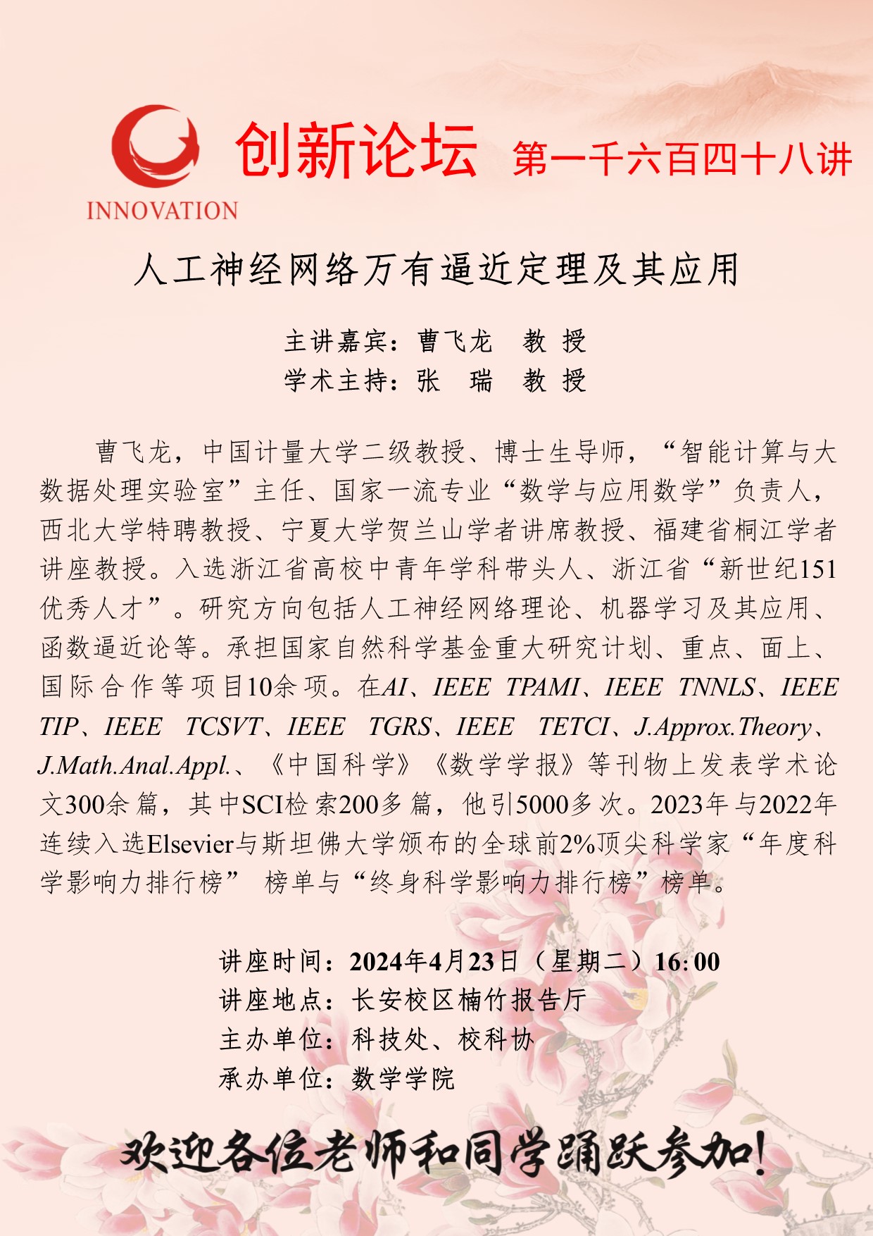 曹飞龙 教授 九游会在线登录官网创新论坛第一千六百四十八讲:人工神经网络万有逼近定理及其应用 讲座时间 2024年4月23日(星期二)16:00 讲座地点 长安校区楠竹报告厅 讲座人介绍 曹飞龙 教授 讲座内容