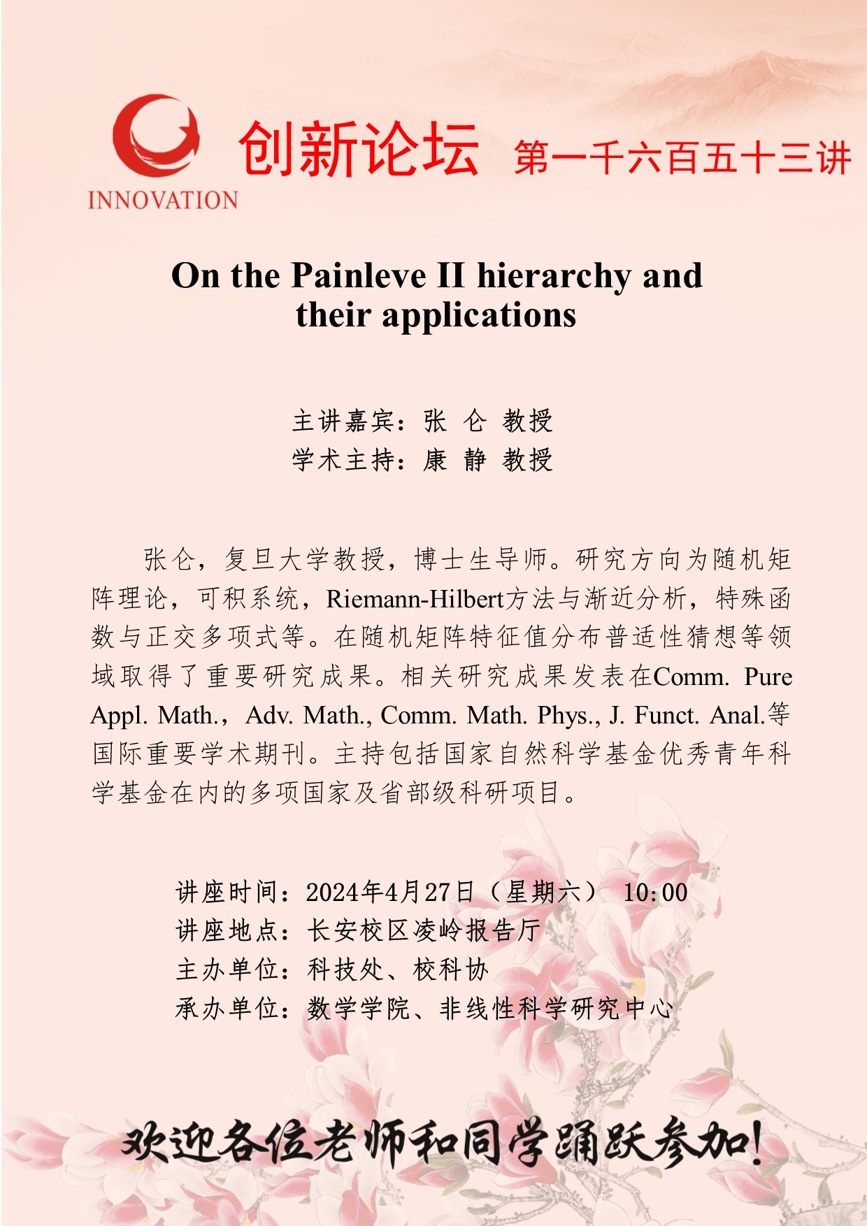 张仑 教授 九游会在线登录官网创新论坛第一千六百五十三讲:On the Painleve II hierarchy and their applications 讲座时间 2024年4月27日(星期六) 10:00 讲座地点 长安校区凌岭报告厅 讲座人介绍 张仑 教授 讲座内容