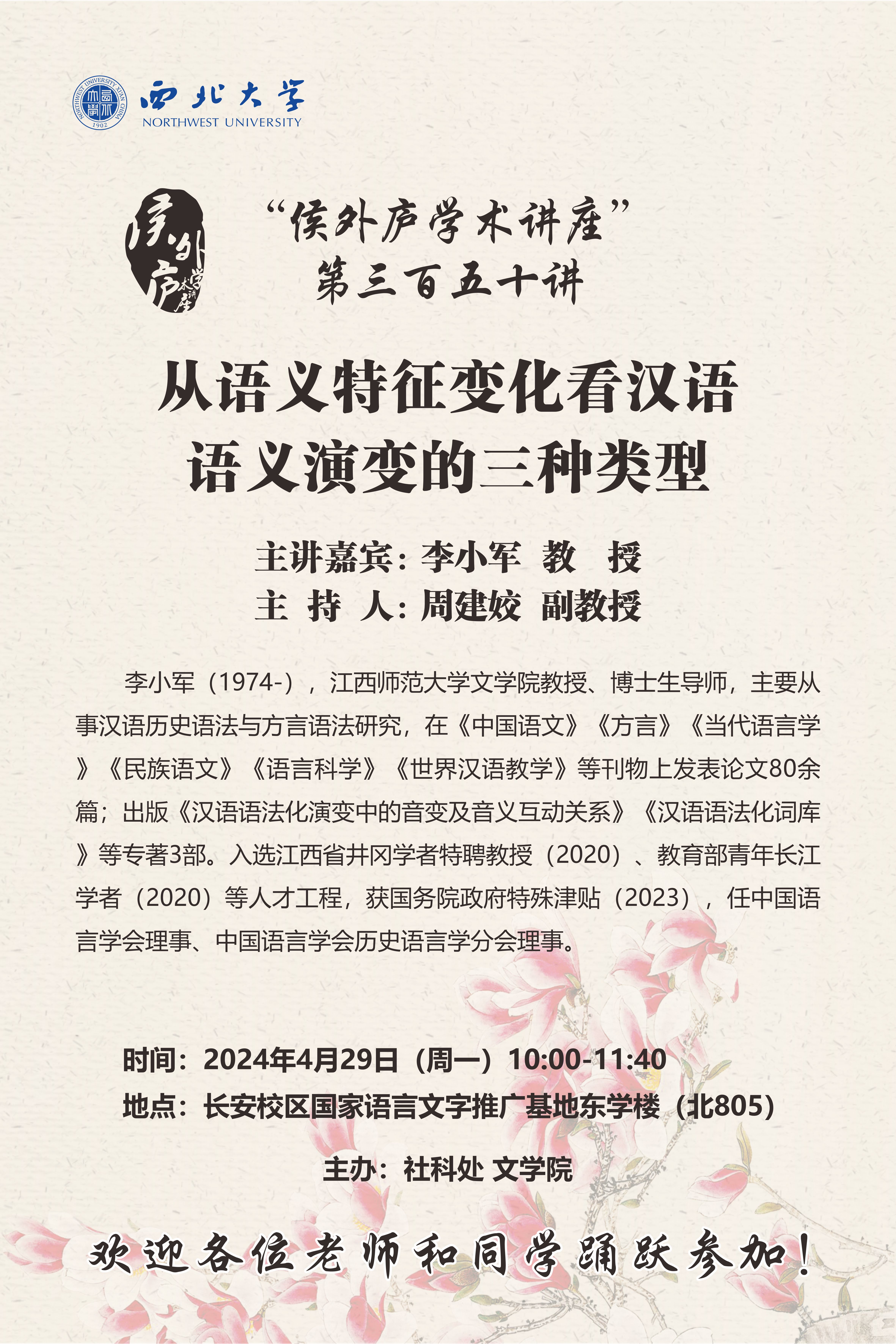 李小军 教授 侯外庐学术讲座第三百五十讲:从语义特征变化看汉语语义演变的三种类型 讲座时间 2024年4月29日(周一)10:00 讲座地点 长安校区国家语言文字推广基地 东学楼(北805) 讲座人介绍 李小军 教授 讲座内容
