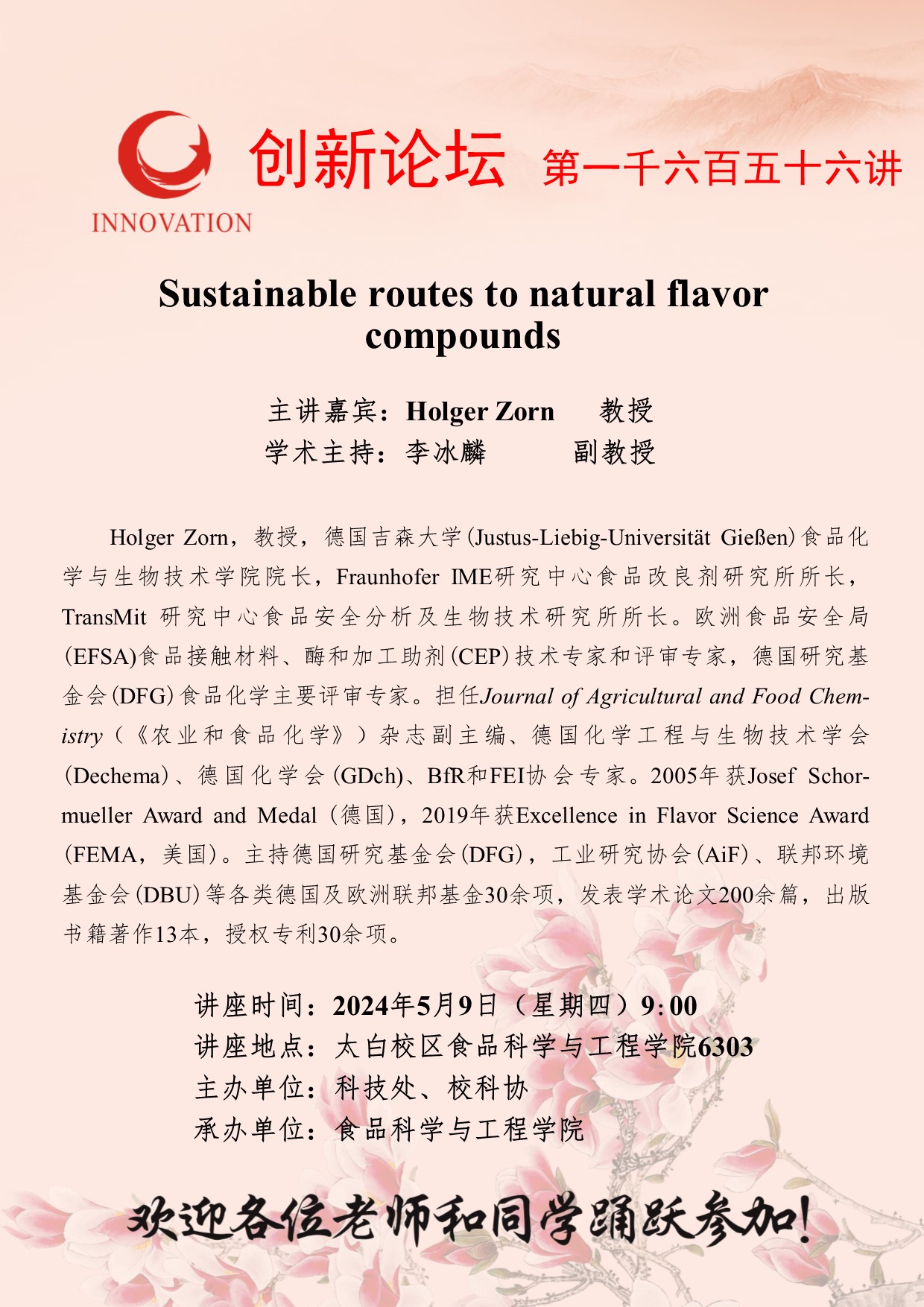 Holger Zorn 教授 九游会在线登录官网创新论坛第一千六百五十六讲:Sustainable routes to natural flavor compounds 讲座时间 2024年5月9日(星期四)9:00 讲座地点 太白校区食品科学与工程学院6303 讲座人介绍 Holger Zorn 教授 讲座内容