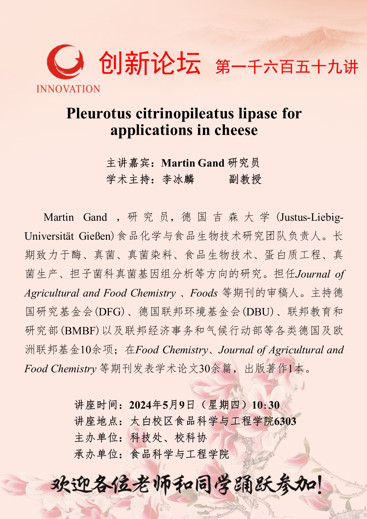 Martin Gand 研究员 九游会在线登录官网创新论坛第一千六百五十九讲:Pleurotus citrinopileatus lipase for applications in cheese 讲座时间 2024年5月9日(星期四)10:30 讲座地点 太白校区食品科学与工程学院6303 讲座人介绍 Martin Gand 研究员 讲座内容
