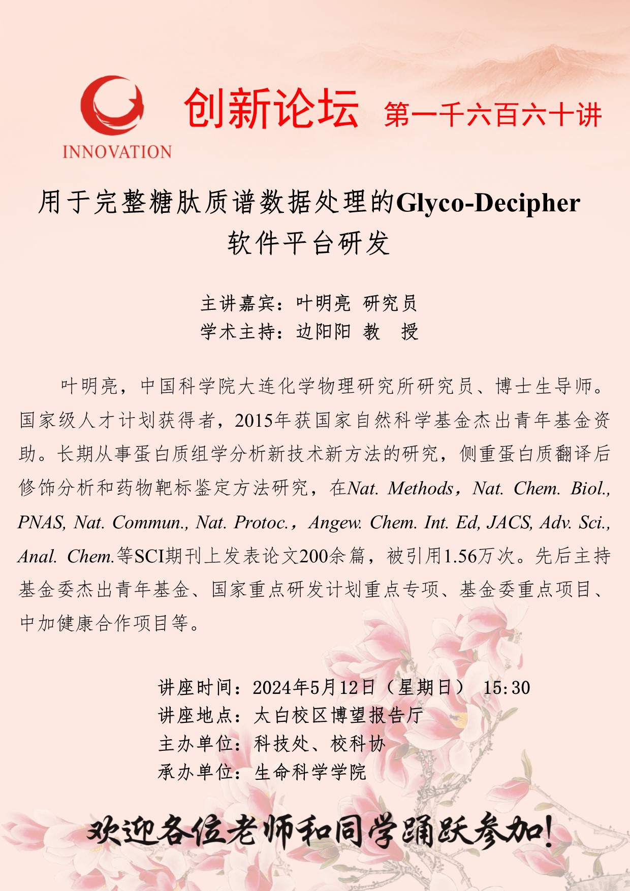 叶明亮 研究员 九游会在线登录官网创新论坛第一千六百六十讲:用于完整糖肽质谱数据处理的Glyco-Decipher软件平台研发 讲座时间 2024年5月12日(星期日) 15:30 讲座地点 太白校区博望报告厅 讲座人介绍 叶明亮 研究员 讲座内容