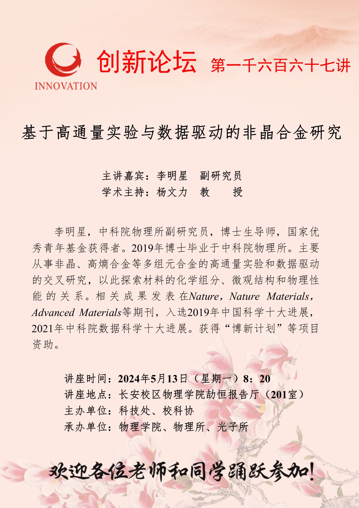 李明星 副研究员 九游会在线登录官网创新论坛第一千六百六十七讲:基于高通量实验与数据驱动的非晶合金研究 讲座时间 2024年5月13日(星期一)8:20 讲座地点 长安校区物理学院劼恒报告厅(201室) 讲座人介绍 李明星 副研究员 讲座内容