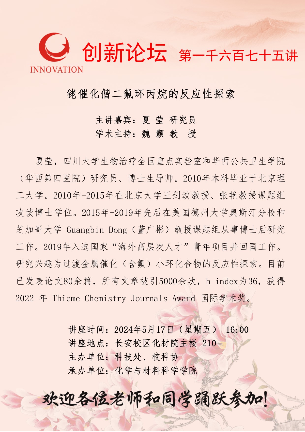 夏莹 研究员 九游会在线登录官网创新论坛第一千六百七十五讲:铑催化偕二氟环丙烷的反应性探索 讲座时间 2024年5月17日(星期五) 16:00 讲座地点 长安校区化材院主楼 210 讲座人介绍 夏莹 研究员 讲座内容