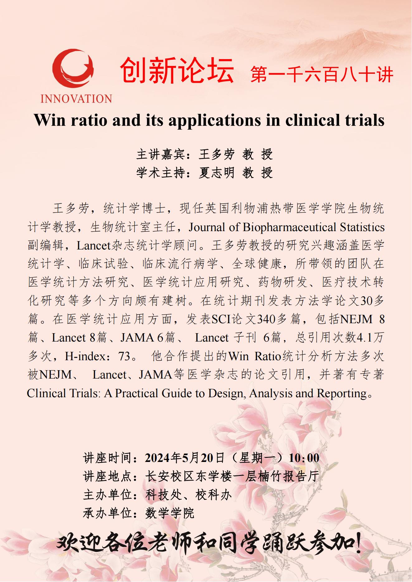 王多劳 教授 九游会在线登录官网创新论坛第一千六百八十讲:Win ratio and its applications in clinical trials 讲座时间 2024年5月20日(星期一) 10:00 讲座地点 长安校区东学楼一层楠竹报告厅 讲座人介绍 王多劳 教授 讲座内容