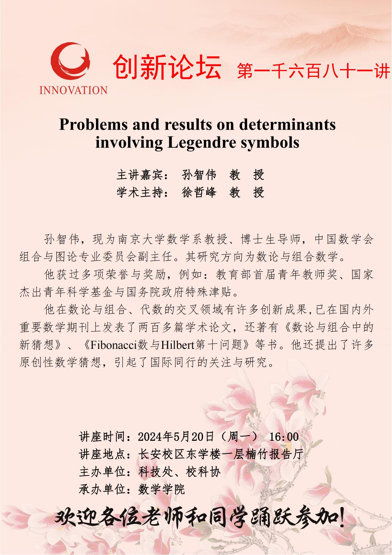 孙智伟 教授 九游会在线登录官网创新论坛第一千六百八十一讲:Problems and results on determinants involving Legendre symbols 讲座时间 2024年5月20日(星期一) 16:00 讲座地点 长安校区东学楼一层楠竹报告厅 讲座人介绍 孙智伟 教授 讲座内容