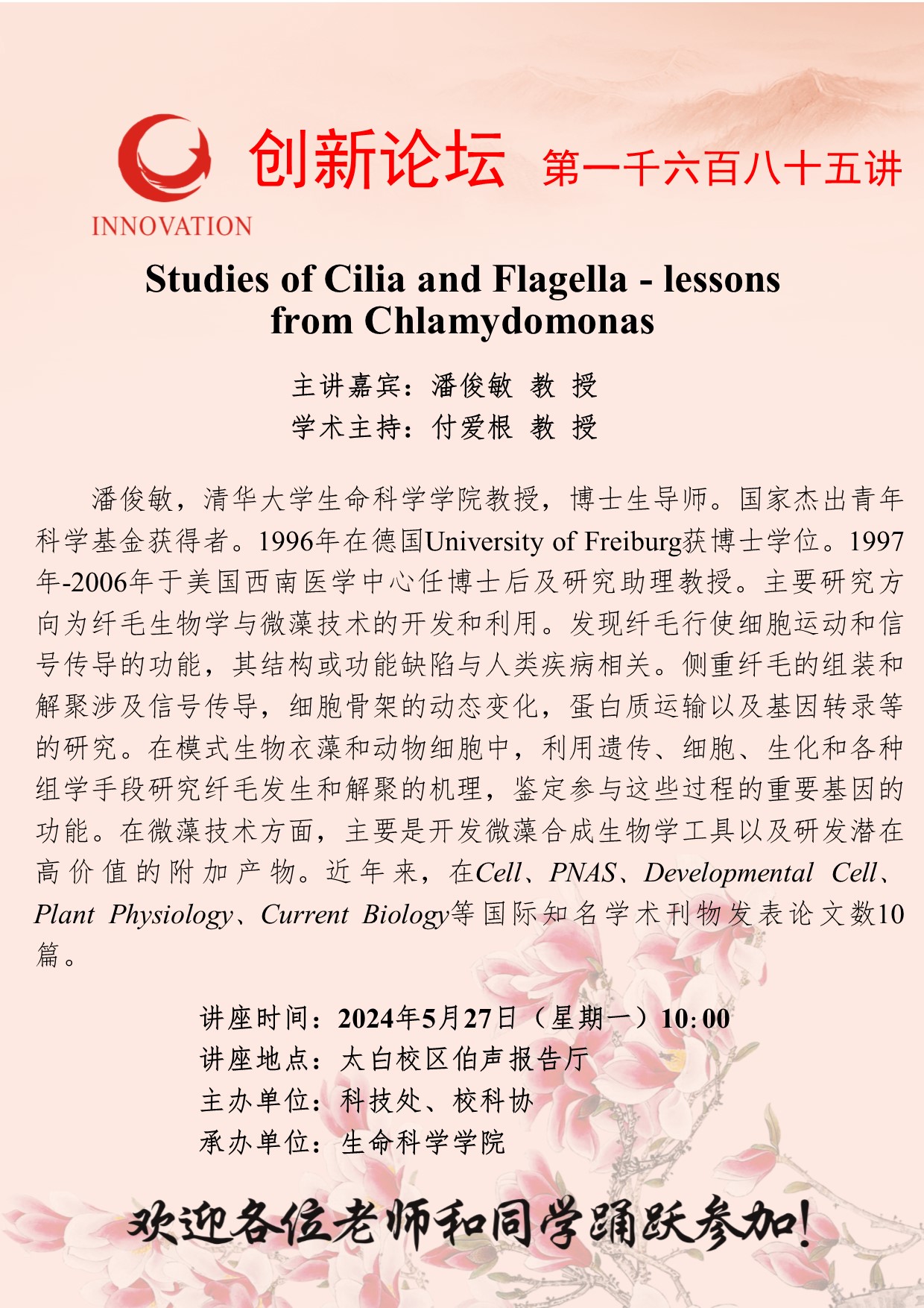 潘俊敏 教授 九游会在线登录官网创新论坛第一千六百八十五讲:Studies of Cilia and Flagella - lessons from Chlamydomonas 讲座时间 2024年5月27日(星期一)10:00 讲座地点 太白校区伯声报告厅 讲座人介绍 潘俊敏 教授 讲座内容