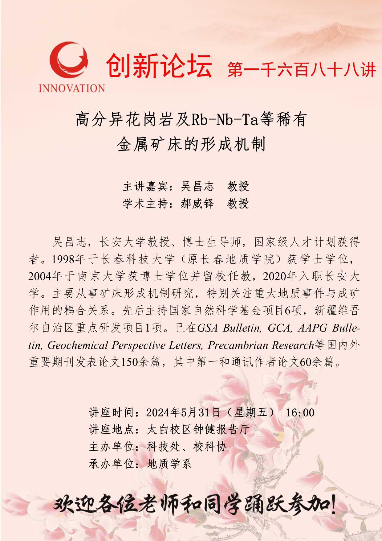 吴昌志 教授 九游会在线登录官网创新论坛第一千六百八十八讲:高分异花岗岩及Rb-Nb-Ta等稀有金属矿床的形成机制 讲座时间 2024年5月31日(星期五) 16:00 讲座地点 太白校区钟健报告厅 讲座人介绍 吴昌志 教授 讲座内容