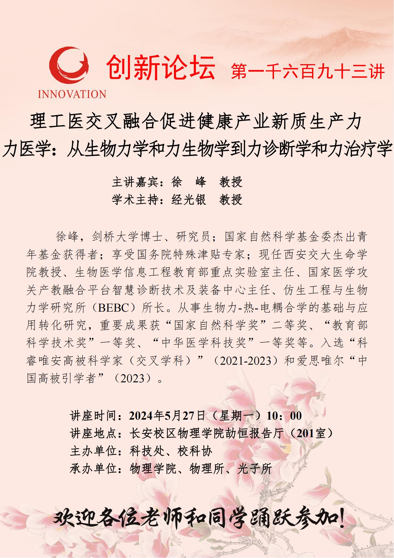 徐峰 教授 九游会在线登录官网创新论坛第一千六百九十三讲:理工医交叉融合促进健康产业新质生产力——力医学:从生物力学和力生物学到力诊断学和力治疗学 讲座时间 2024年5月27日(星期一)10:00 讲座地点 长安校区物理学院劼恒报告厅(201室) 讲座人介绍 徐峰 教授 讲座内容