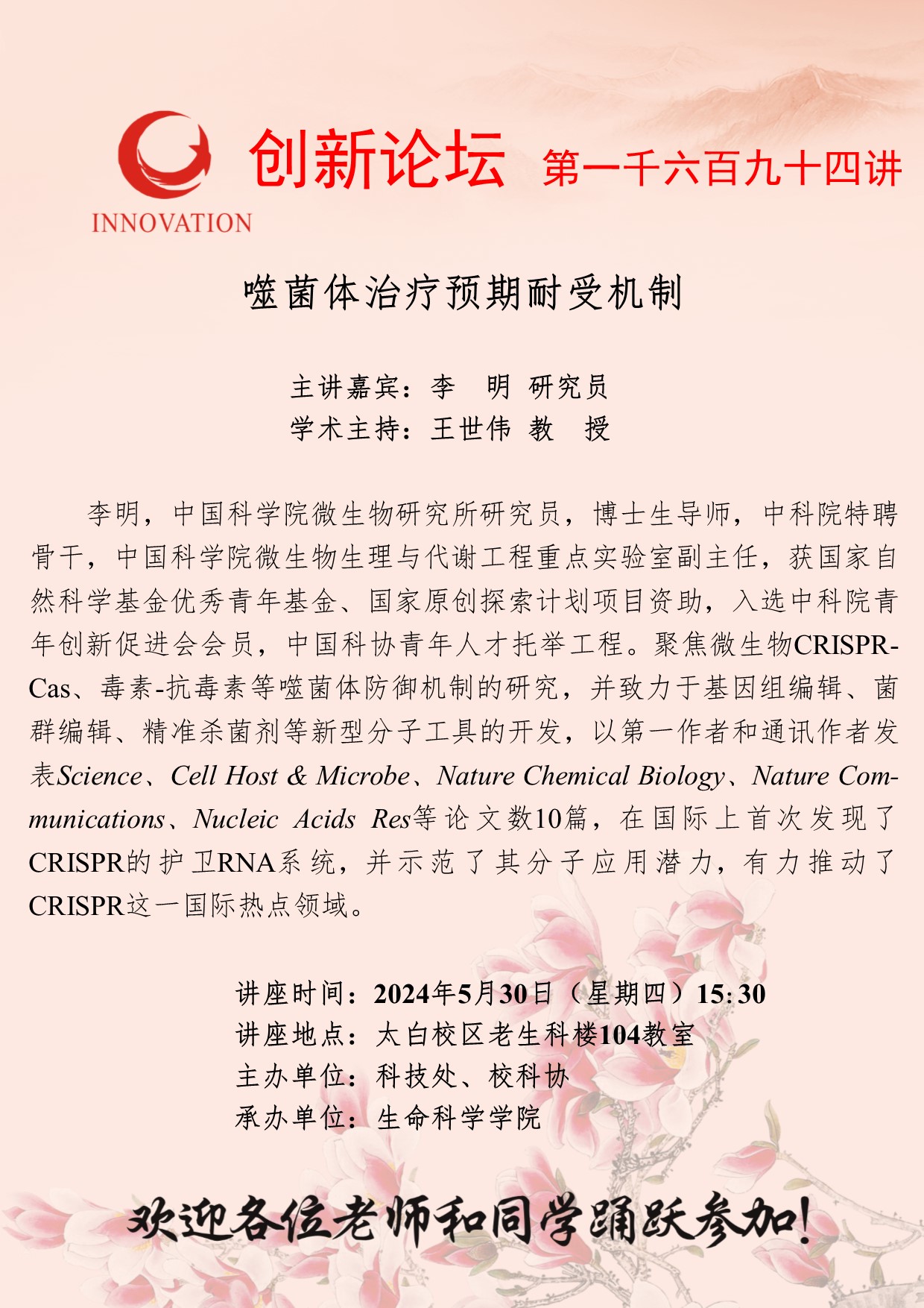 李明 研究员 九游会在线登录官网创新论坛第一千六百九十四讲:噬菌体治疗预期耐受机制 讲座时间 2024年5月30日(星期四)15:30 讲座地点 太白校区老生科楼104教室 讲座人介绍 李明 研究员 讲座内容