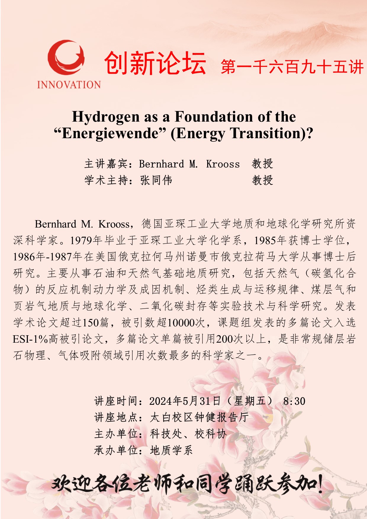 Bernhard M. Krooss 教授 九游会在线登录官网创新论坛第一千六百九十五讲:Hydrogen as a Foundation of the “Energiewende” (Energy Transition)? 讲座时间 2024年5月31日(星期五) 8:30 讲座地点 太白校区钟健报告厅 讲座人介绍 Bernhard M. Krooss 教授 讲座内容