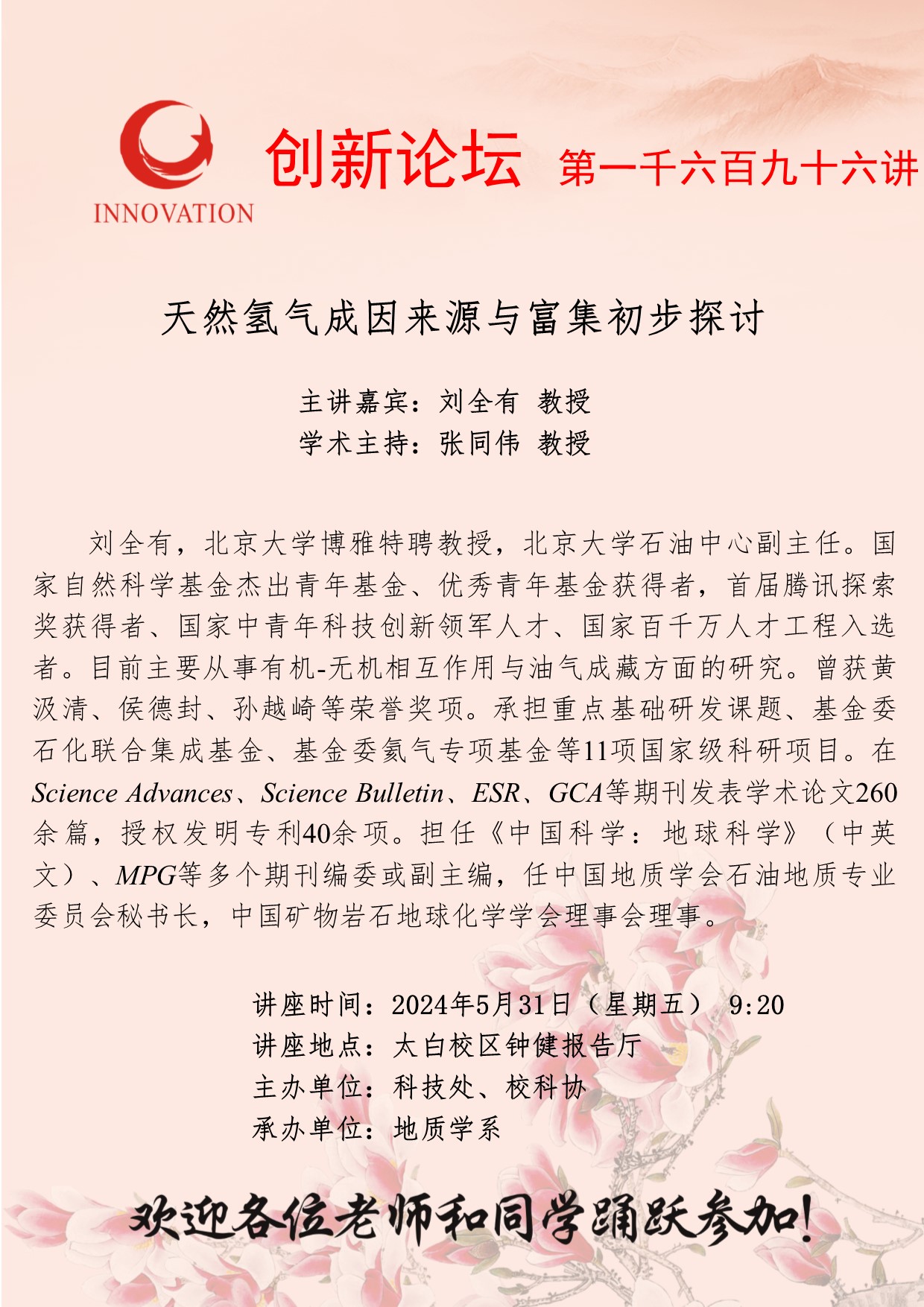 刘全有 教授 九游会在线登录官网创新论坛第一千六百九十六讲:天然氢气成因来源与富集初步探讨 讲座时间 2024年5月31日(星期五) 9:20 讲座地点 太白校区钟健报告厅 讲座人介绍 刘全有 教授 讲座内容