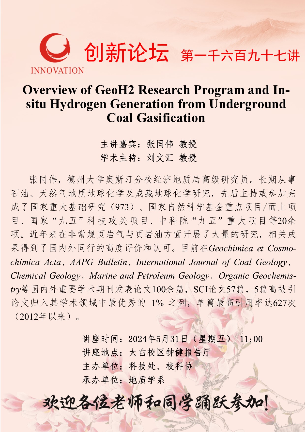 张同伟 教授 九游会在线登录官网创新论坛第一千六百九十七讲:Overview of GeoH2 Research Program and In-situ Hydrogen Generation from Underground Coal Gasification 讲座时间 2024年5月31日(星期五) 11:00 讲座地点 太白校区钟健报告厅 讲座人介绍 张同伟 教授 讲座内容