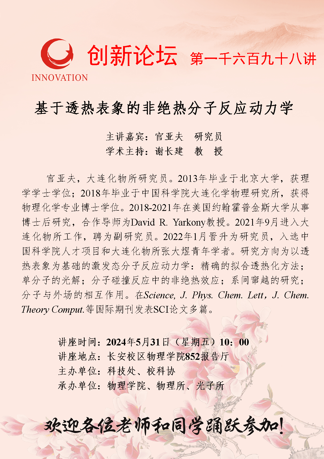 官亚夫 研究员 九游会在线登录官网创新论坛第一千六百九十八讲:基于透热表象的非绝热分子反应动力学 讲座时间 2024年5月31日(星期五)10:00 讲座地点 长安校区物理学院852报告厅 讲座人介绍 官亚夫 研究员 讲座内容