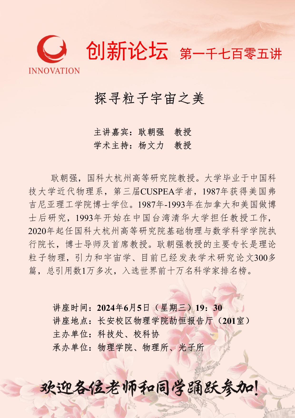 耿朝强 教授 九游会在线登录官网创新论坛第一千七百零五讲:探寻粒子宇宙之美 讲座时间 2024年6月5日(星期三)19:30 讲座地点 长安校区物理学院劼恒报告厅(201室) 讲座人介绍 耿朝强 教授 讲座内容