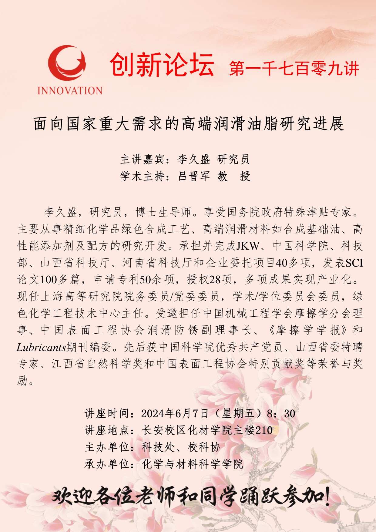 李久盛 研究员 九游会在线登录官网创新论坛第一千七百零九讲:面向国家重大需求的高端润滑油脂研究进展 讲座时间 2024年6月7日(星期五)8:30 讲座地点 长安校区化材学院主楼210 讲座人介绍 李久盛 研究员 讲座内容