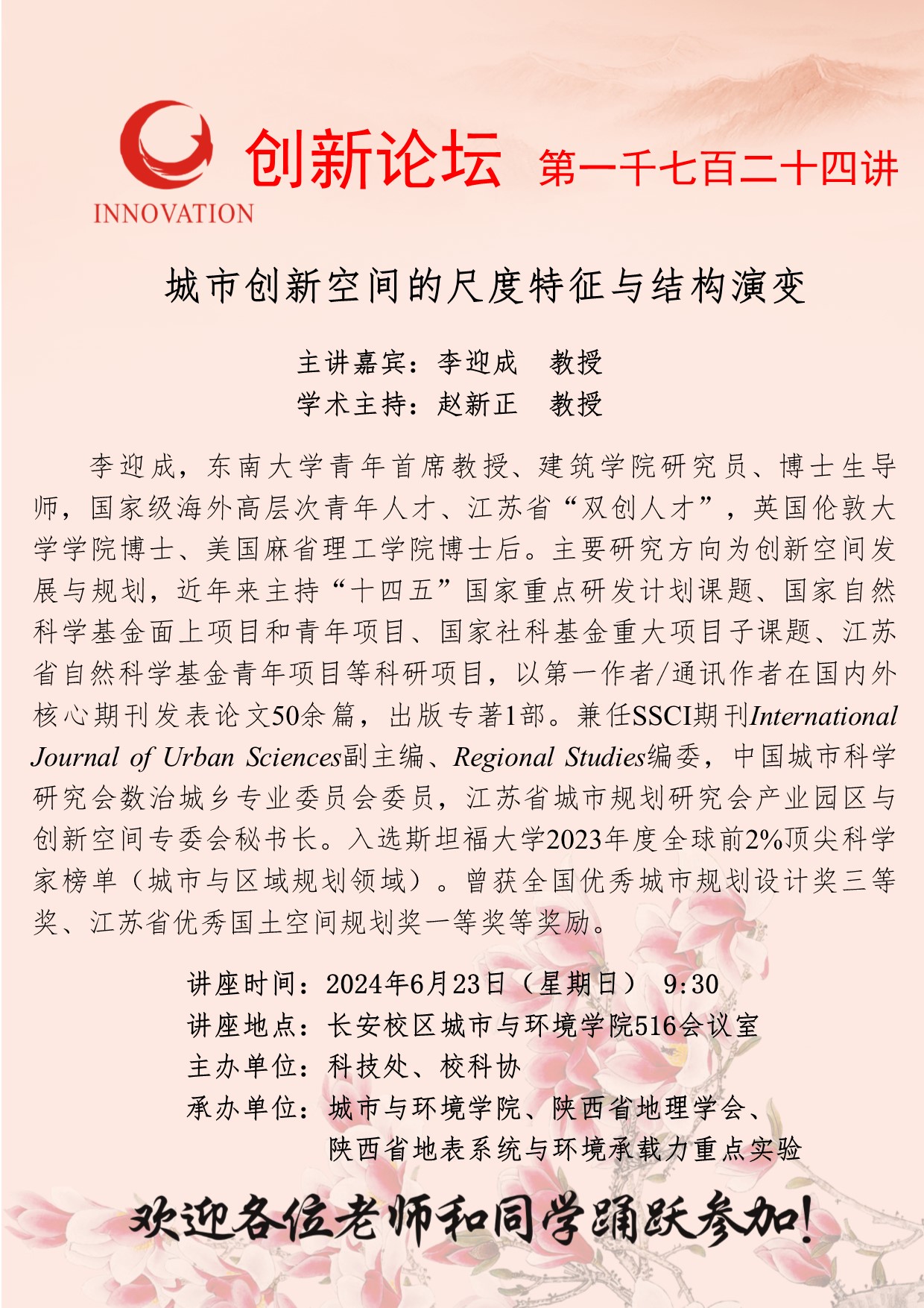 李迎成 教授 九游会在线登录官网创新论坛第一千七百二十四讲:城市创新空间的尺度特征与结构演变 讲座时间 2024年6月23日(星期日) 9:30 讲座地点 长安校区城市与环境学院516会议室 讲座人介绍 李迎成 教授 讲座内容