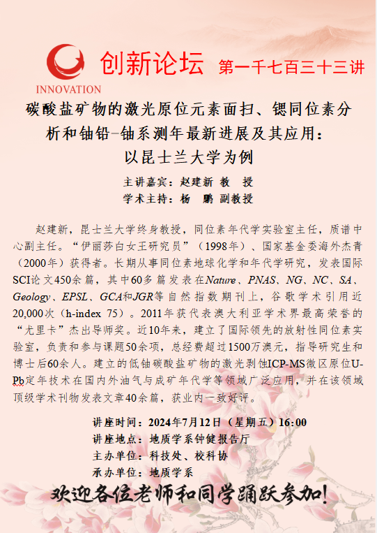赵建新 教授 九游会在线登录官网创新论坛第一千七百三十三讲:碳酸盐矿物的激光原位元素面扫、锶同位素分析和铀铅-铀系测年最新进展及其应用:以昆士兰大学为例 讲座时间 2024年7月12日(星期五)16:00 讲座地点 地质学系钟健报告厅 讲座人介绍 赵建新 教授 讲座内容