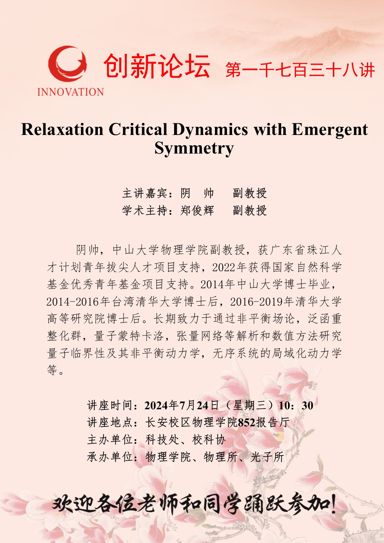 阴帅 副教授 九游会在线登录官网创新论坛第一千七百三十八讲:Relaxation Critical Dynamics with Emergent Symmetry 讲座时间 2024年7月24日(星期三)10:30 讲座地点 长安校区物理学院852报告厅 讲座人介绍 阴帅 副教授 讲座内容
