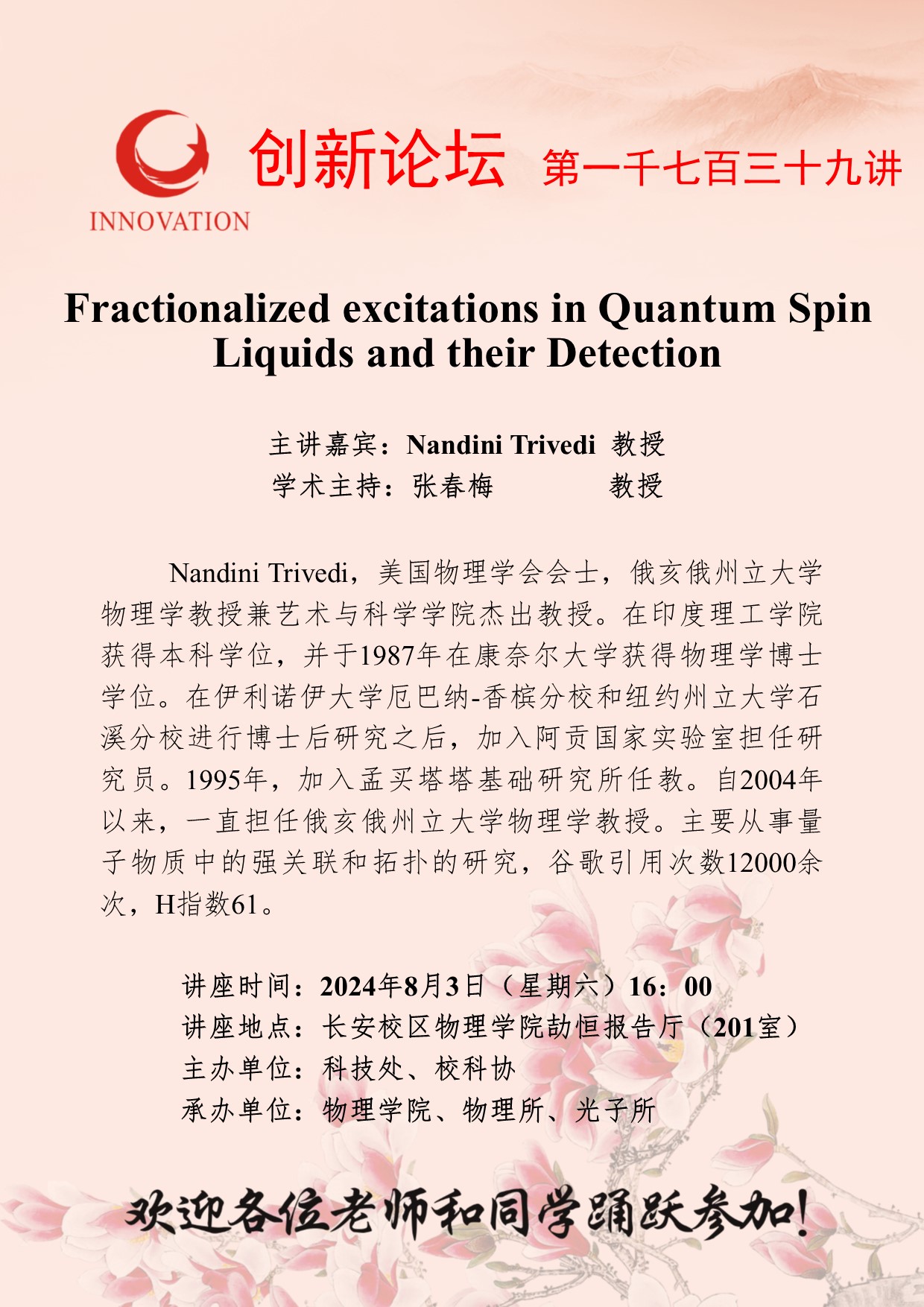 Nandini Trivedi 教授 九游会在线登录官网创新论坛第一千七百三十九讲:Fractionalized excitations in Quantum Spin Liquids and their Detection 讲座时间 2024年8月3日(星期六)16:00 讲座地点 长安校区物理学院劼恒报告厅(201室) 讲座人介绍 Nandini Trivedi 教授 讲座内容