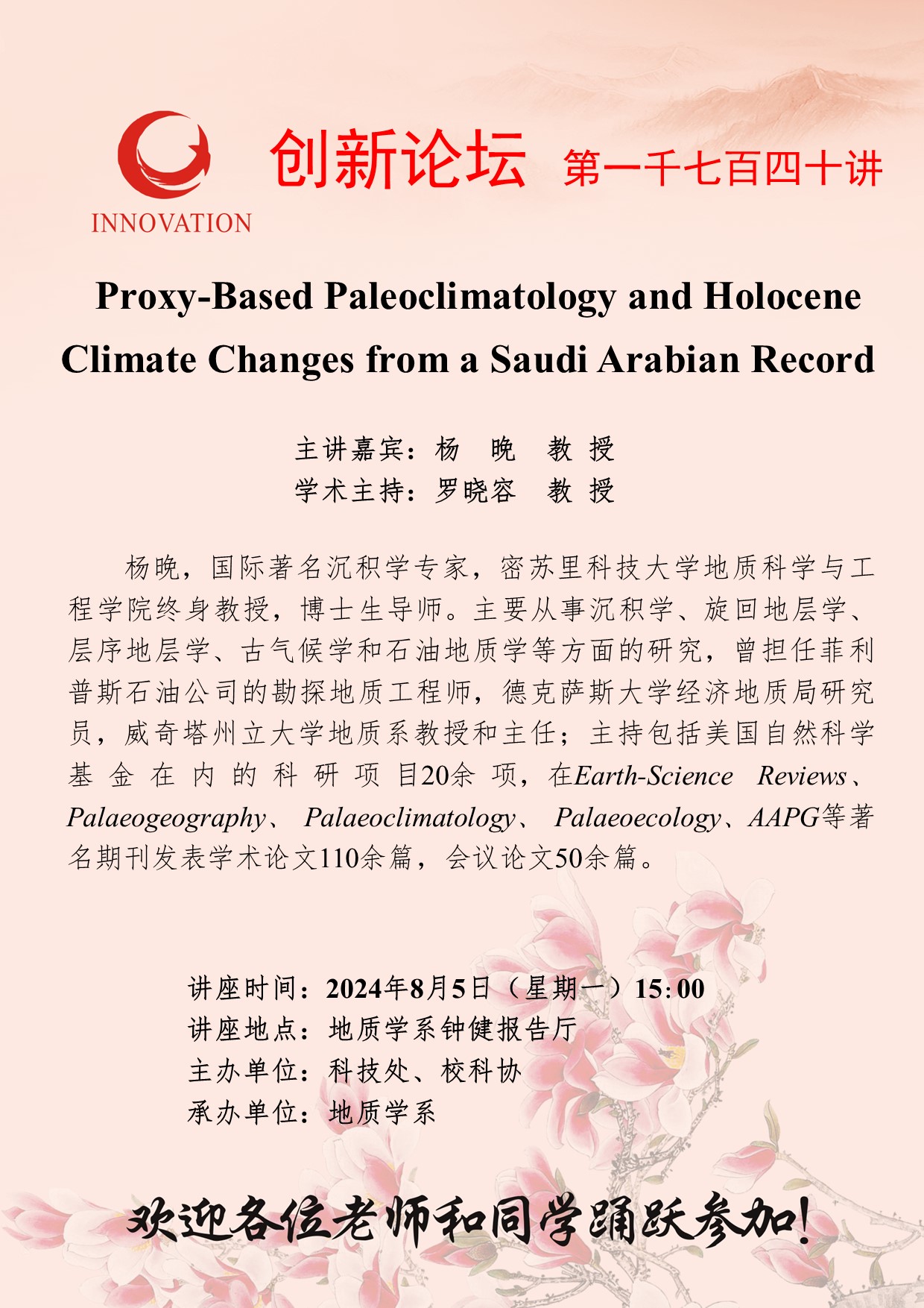 杨晚 教授 九游会在线登录官网创新论坛第一千七百四十讲: Proxy-Based Paleoclimatology and Holocene Climate Changes from a Saudi Arabian Record 讲座时间 2024年8月5日(星期一)15:00 讲座地点 地质学系钟健报告厅 讲座人介绍 杨晚 教授 讲座内容