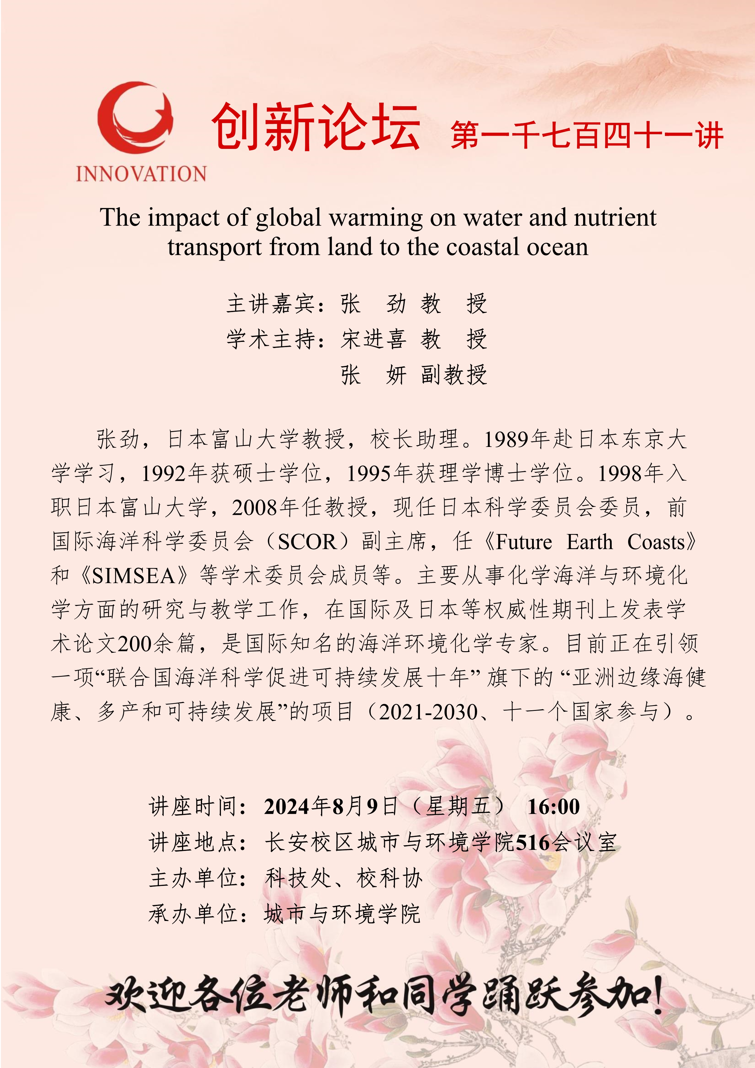 张劲 教授 九游会在线登录官网创新论坛第一千七百四十一讲:The impact of global warming on water and nutrient transport from land to the coastal ocean 讲座时间 2024年8月9日(星期五)16:00 讲座地点 长安校区城市与环境学院516会议室 讲座人介绍 张劲 教授 讲座内容