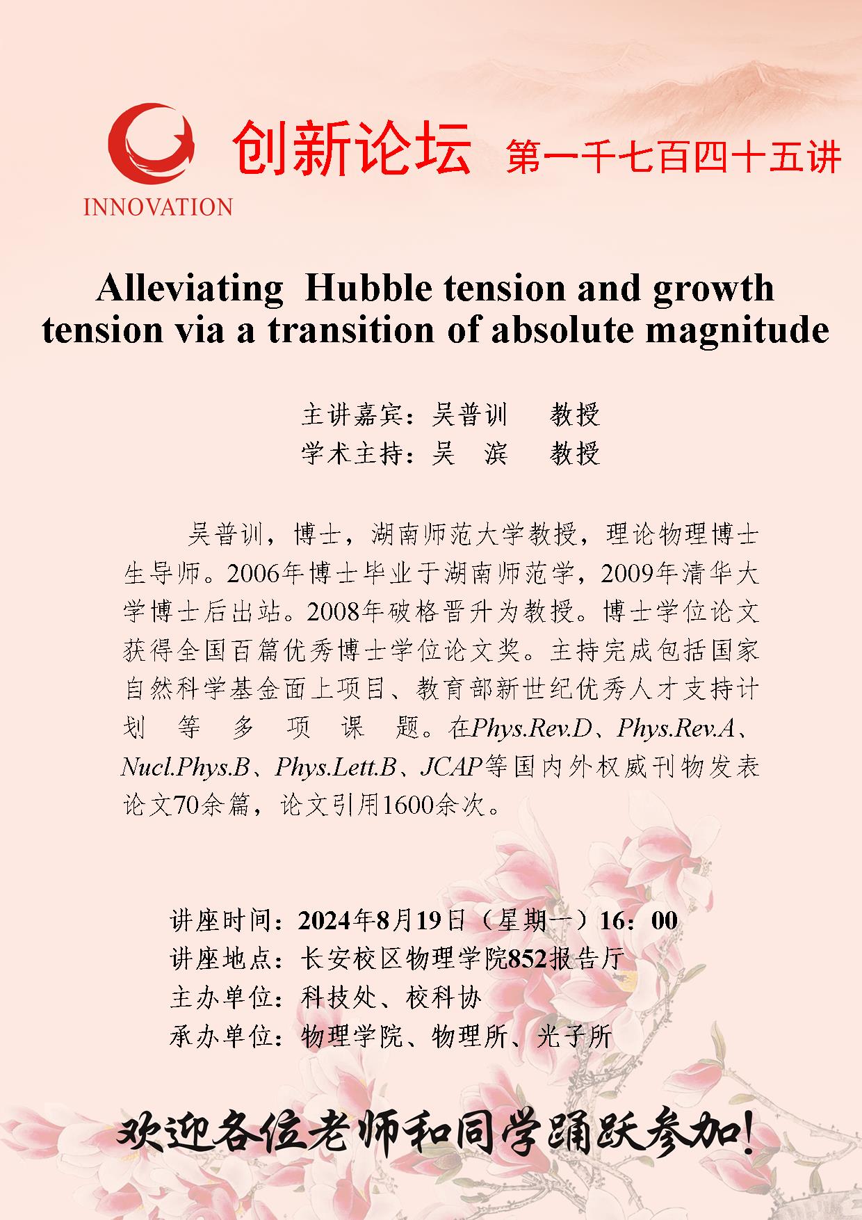 吴普训 教授 九游会在线登录官网创新论坛第一千七百四十五讲:Alleviating Hubble tension and growth tension via a transition of absolute magnitude 讲座时间 2024年8月19日(星期一)16:00 讲座地点 长安校区物理学院852报告厅 讲座人介绍 吴普训 教授 讲座内容