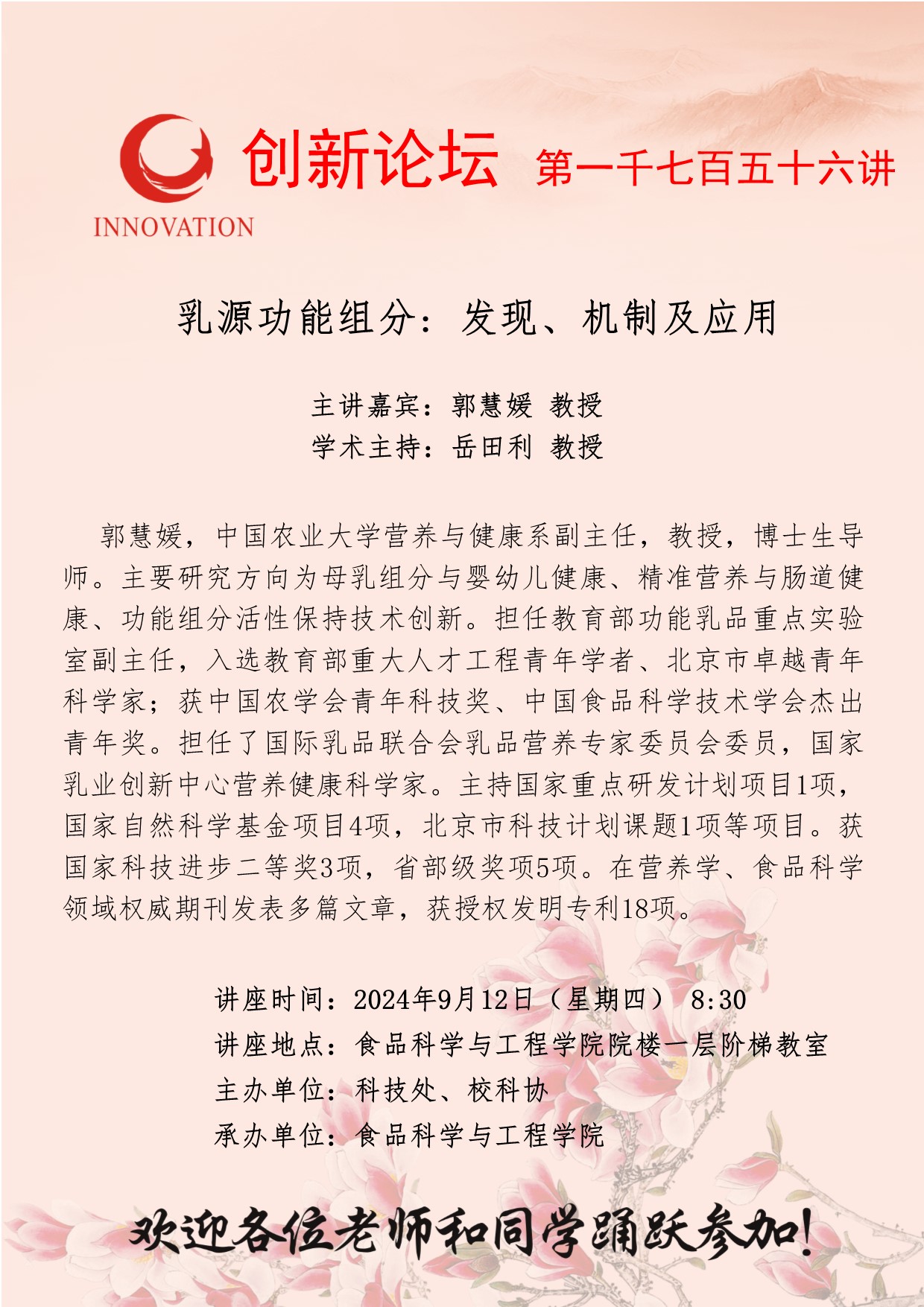 郭慧媛 教授 九游会在线登录官网创新论坛第一千七百五十六讲: 乳源功能组分: 发现、机制及应用 讲座时间 2024年9月12日(星期四) 8:30 讲座地点 食品科学与工程学院院楼一层阶梯教室 讲座人介绍 郭慧媛 教授 讲座内容