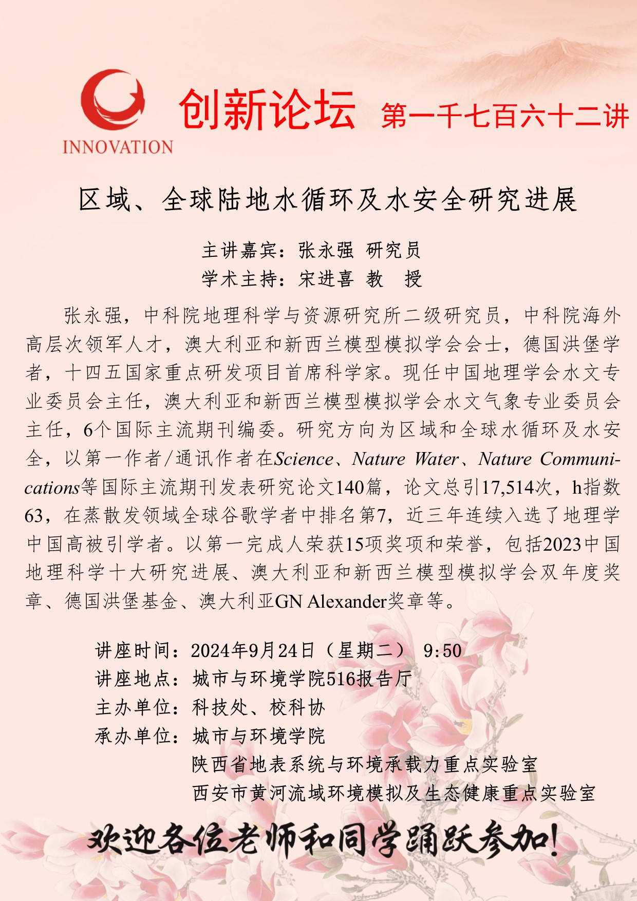 张永强 研究员 九游会在线登录官网创新论坛第一千七百六十二讲:区域、全球陆地水循环及水安全研究进展 讲座时间 2024年9月24日(星期二) 9:50 讲座地点 城市与环境学院516报告厅 讲座人介绍 张永强 研究员 讲座内容