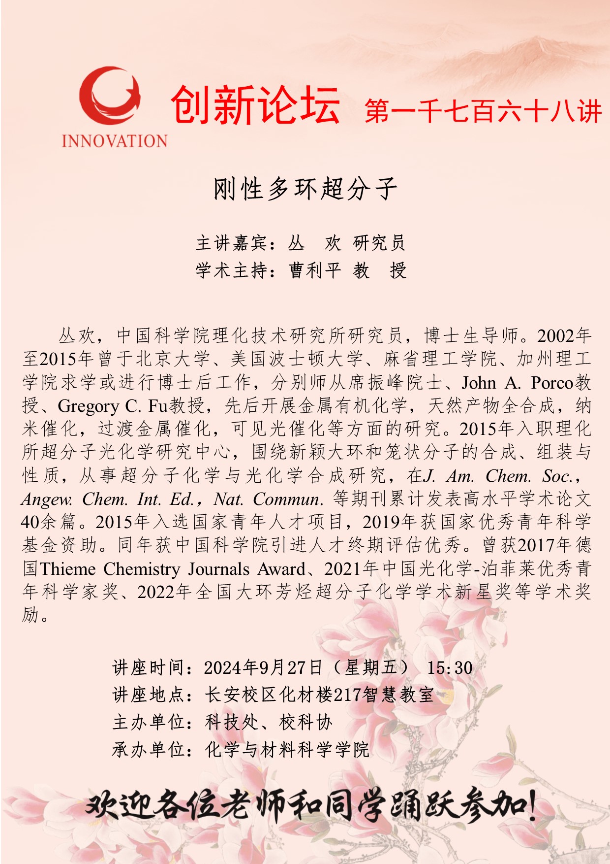 丛欢 研究员 九游会在线登录官网创新论坛第一千七百六十八讲:刚性多环超分子 讲座时间 2024年9月27日(星期五) 15:30 讲座地点 长安校区化材楼217智慧教室 讲座人介绍 丛欢 研究员 讲座内容