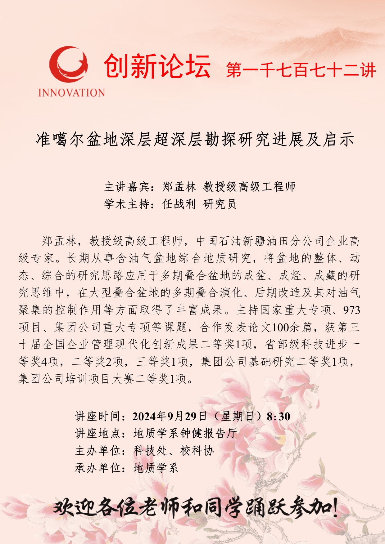 郑孟林 教授级高级工程师 九游会在线登录官网创新论坛第一千七百七十二讲:准噶尔盆地深层超深层勘探研究进展及启示 讲座时间 2024年9月29日(星期日)8:30 讲座地点 地质学系钟健报告厅 讲座人介绍 郑孟林 教授级高级工程师 讲座内容