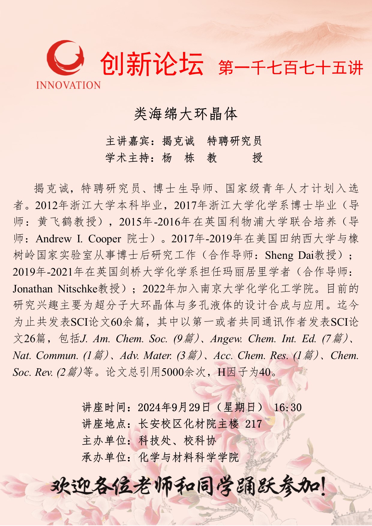 揭克诚 特聘研究员 九游会在线登录官网创新论坛第一千七百七十五讲:类海绵大环晶体 讲座时间 2024年9月29日(星期日) 16:30 讲座地点 长安校区化材院主楼 217 讲座人介绍 揭克诚 特聘研究员 讲座内容