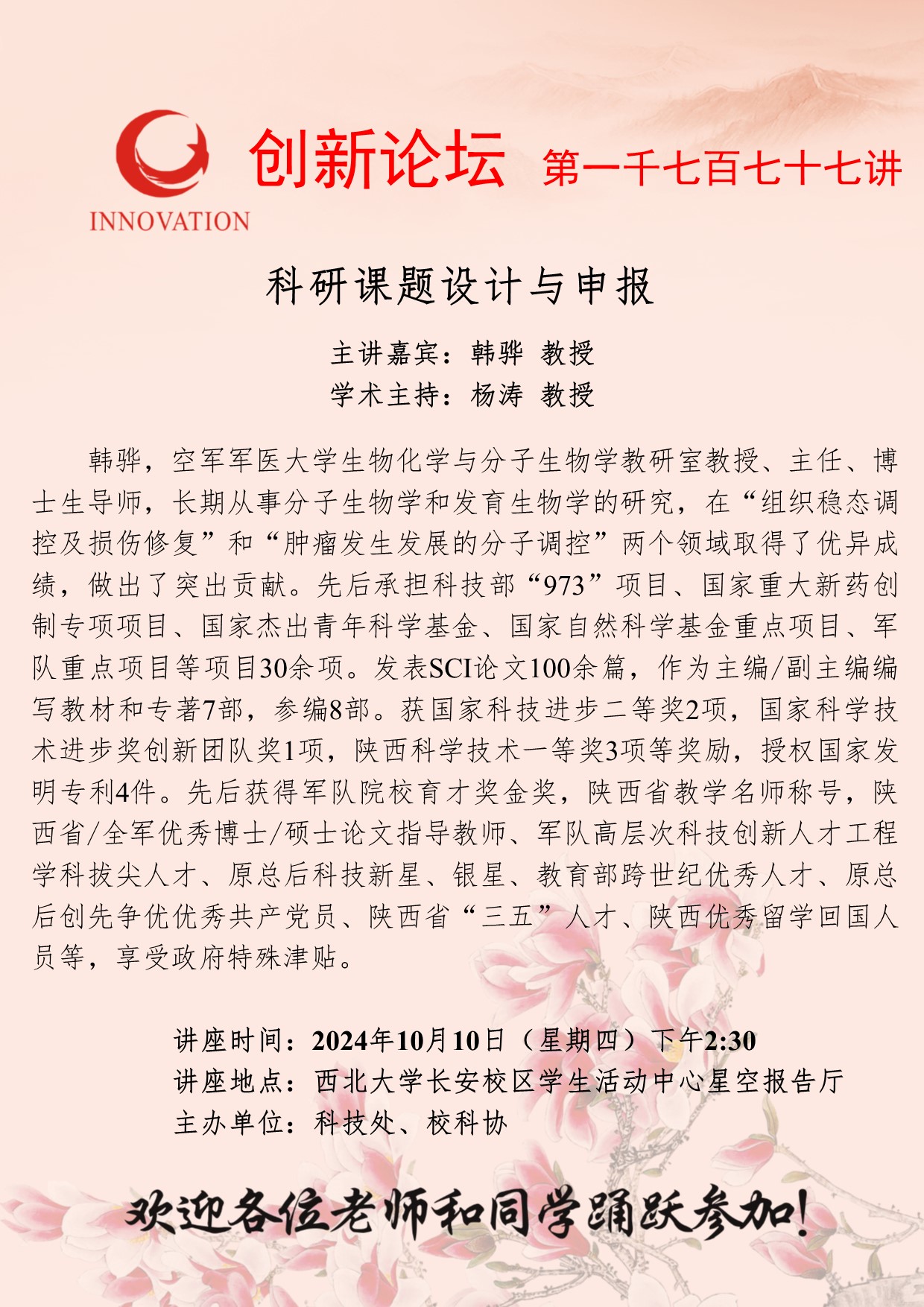 韩骅 教授 九游会在线登录官网创新论坛第一千七百七十七讲:科研课题设计与申报 讲座时间 2024年10月10日(星期四)下午2:30 讲座地点 九游会在线登录官网长安校区学生活动中心星空报告厅 讲座人介绍 韩骅 教授 讲座内容