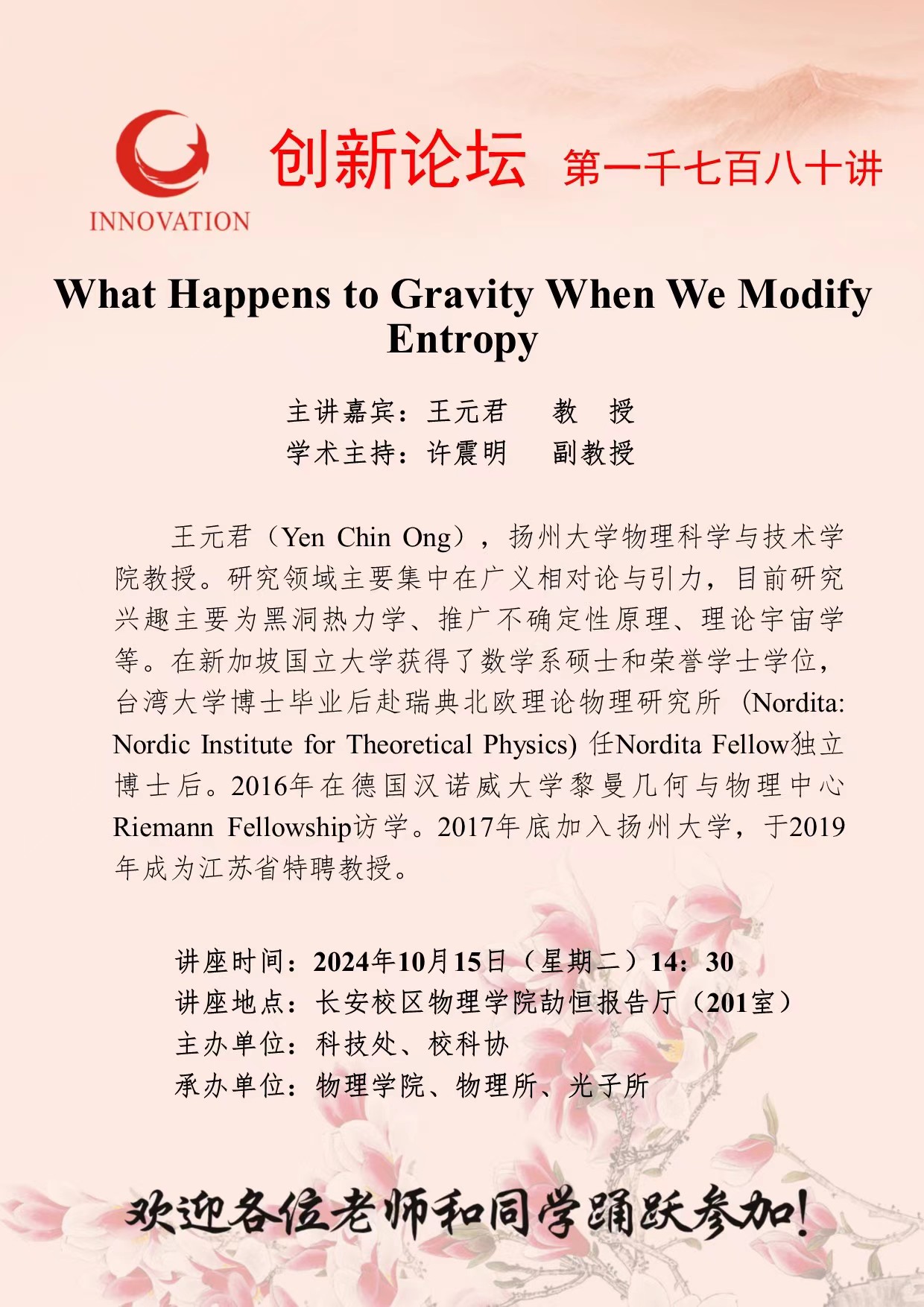 王元君 教授 九游会在线登录官网创新论坛第一千七百八十讲:What Happens to Gravity When We Modify Entropy 讲座时间 2024年10月15日(星期二)14:30 讲座地点 长安校区物理学院劼恒报告厅(201室) 讲座人介绍 王元君 教授 讲座内容