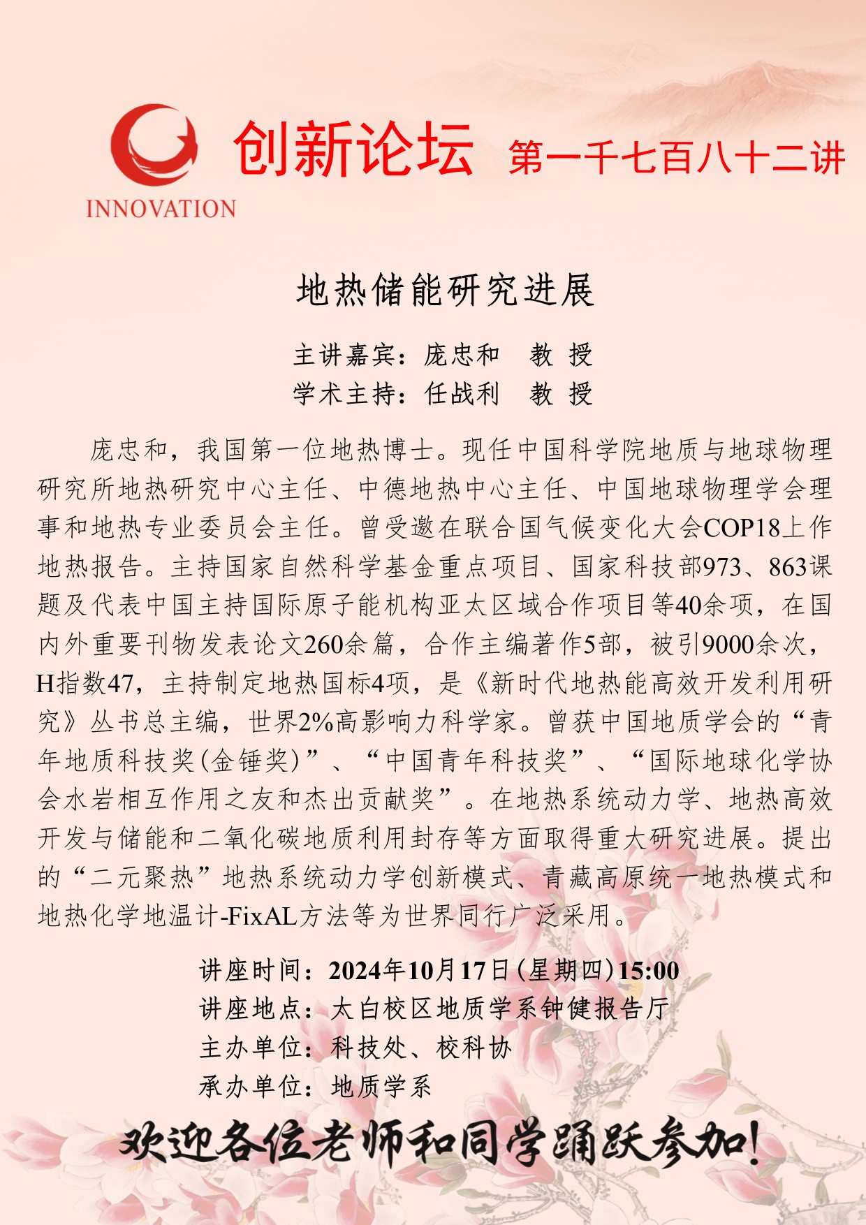 庞忠和 教授 九游会在线登录官网创新论坛第一千七百八十二讲:地热储能研究进展 讲座时间 2024年10月17日(星期四)15:00 讲座地点 太白校区地质学系钟健报告厅 讲座人介绍 庞忠和 教授 讲座内容